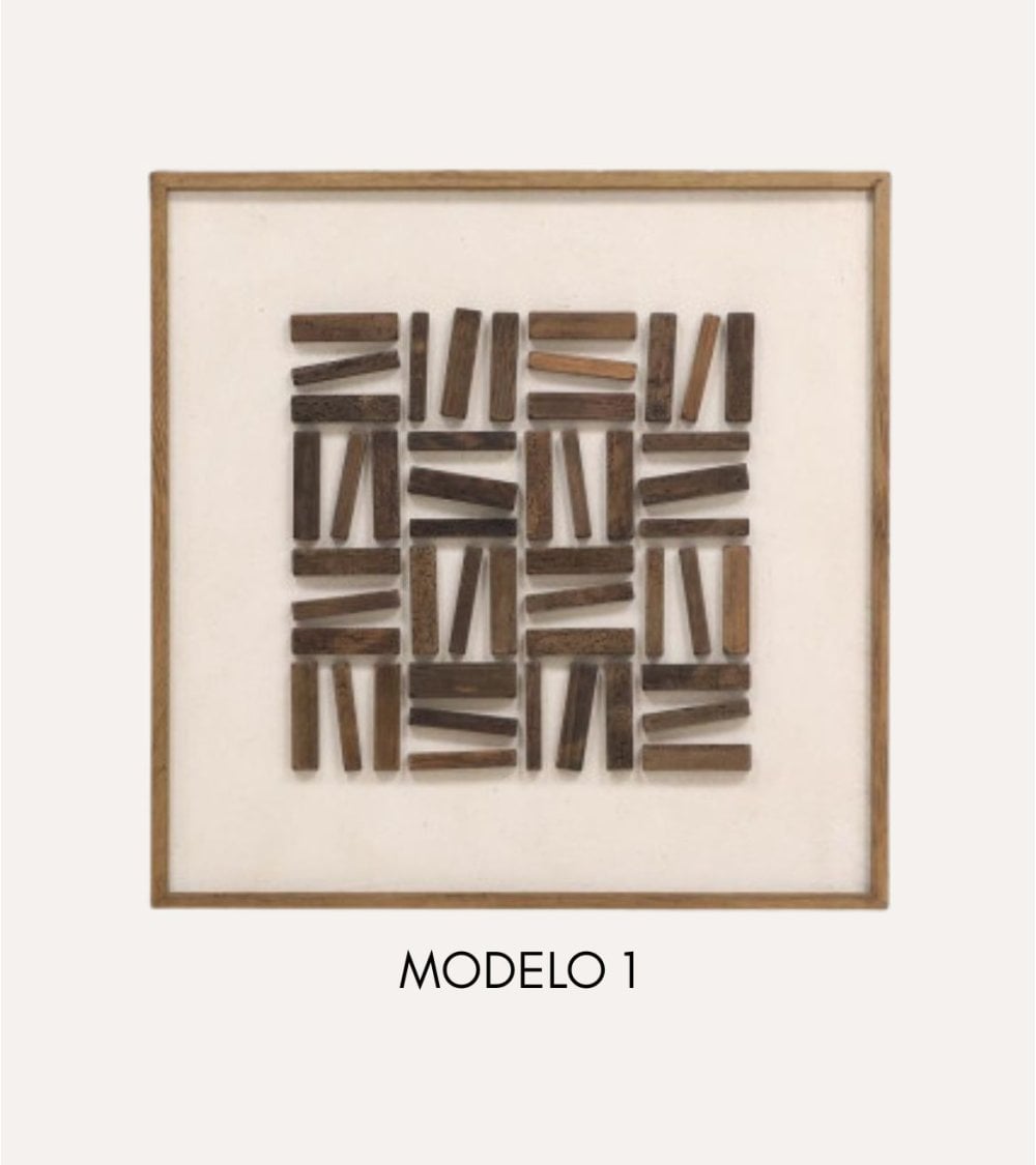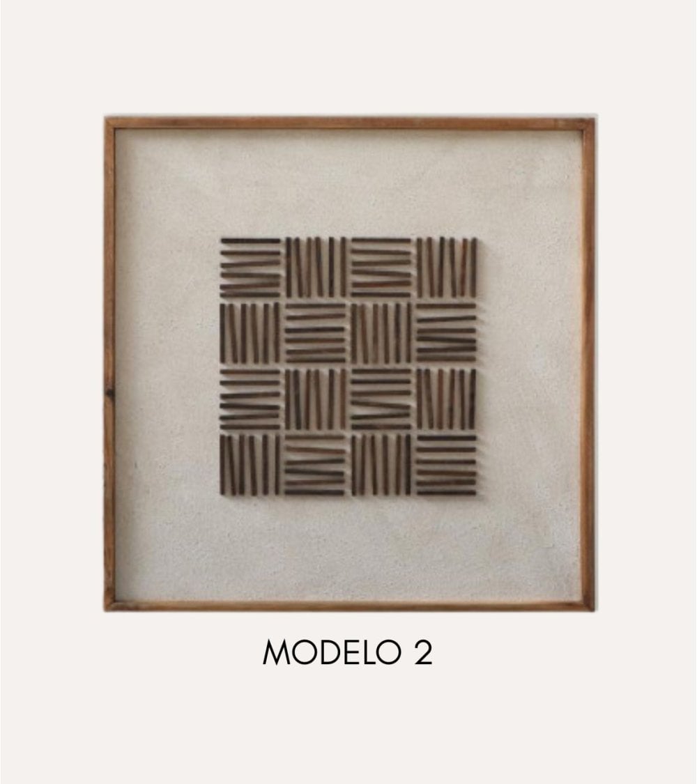 El cuadro está elaborado con madera de pino reciclada, lo que no solo garantiza un producto ecológico, sino también una textura y tonalidad únicas en cada pieza. Su diseño minimalista y geométrico se adapta perfectamente a diferentes estilos decorativos, desde modernos hasta rústicos, haciendo que sea un complemento versátil para salones, oficinas o galerías.