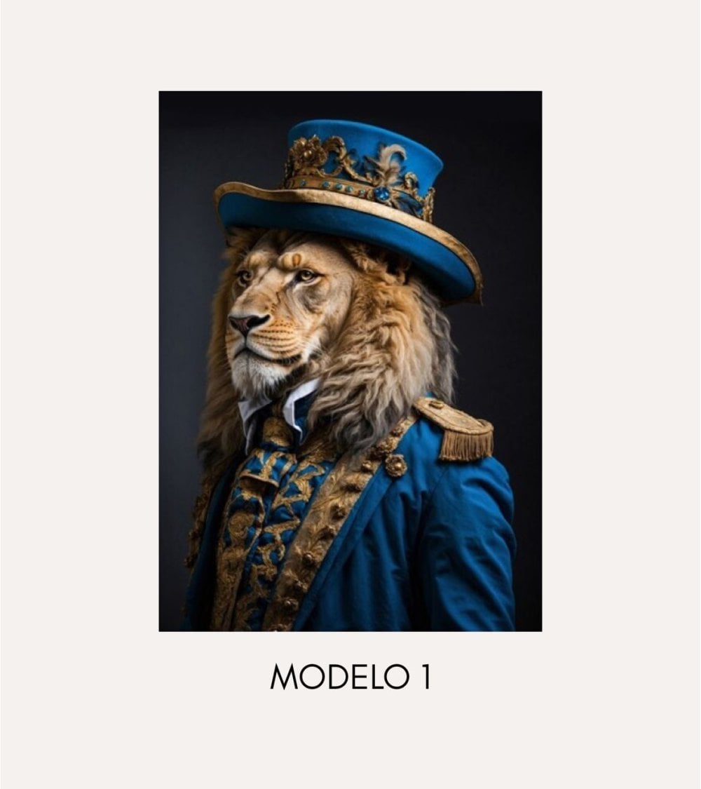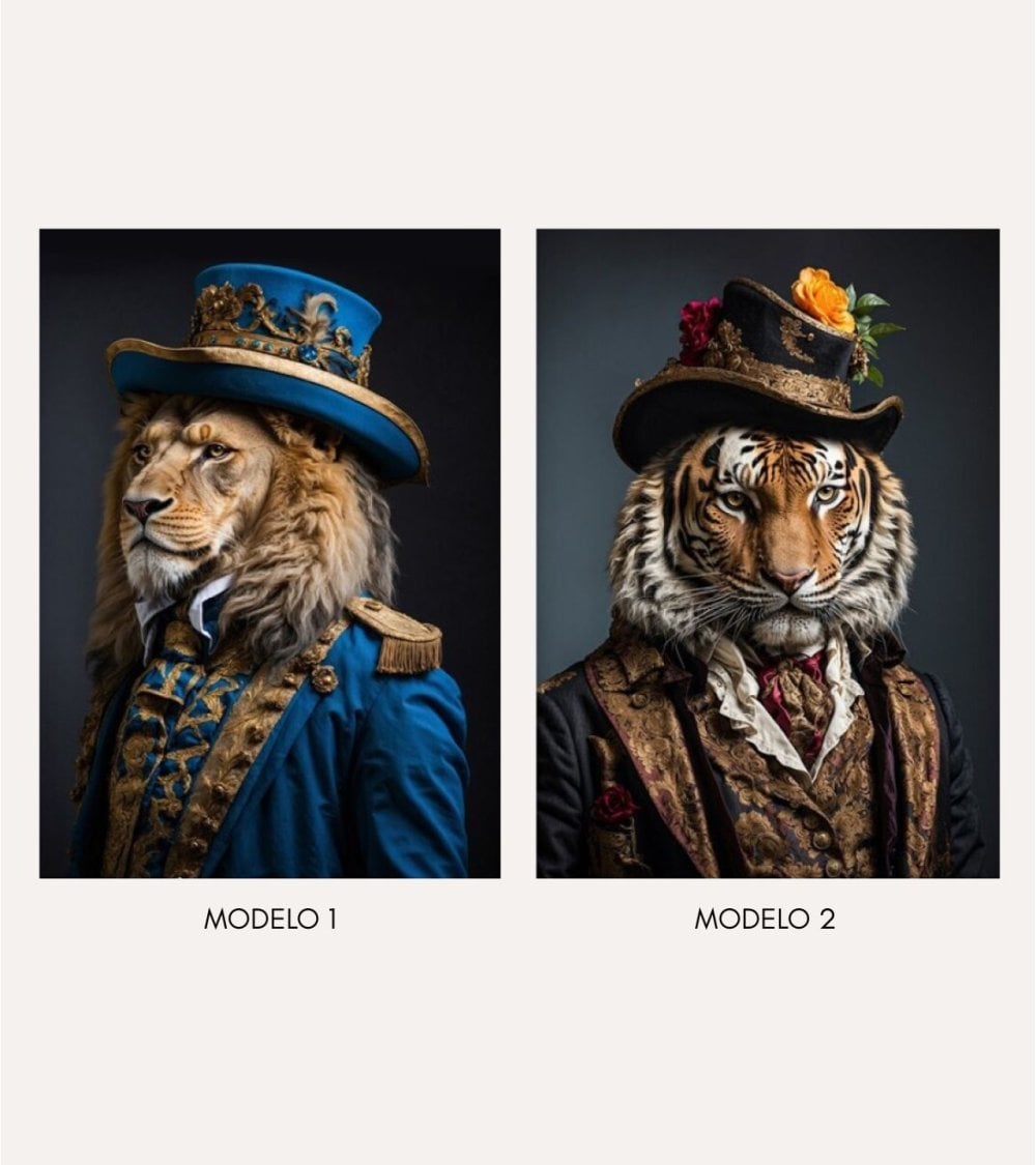 Fabricado por Nahuel Home, este cuadro es ideal para quienes buscan darle a sus espacios un aire distinguido y artístico. La impresión en lienzo resalta cada detalle, desde la melena majestuosa del león hasta las rayas vibrantes del tigre, así como los ricos colores y texturas de sus trajes clásicos. El fondo neutro permite que los colores vivos y los detalles dorados de las prendas se conviertan en el centro visual, aportando sofisticación a cualquier ambiente.