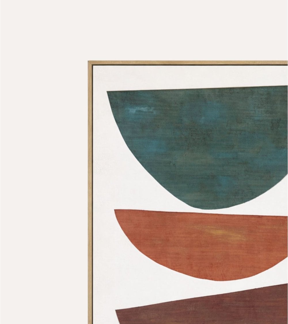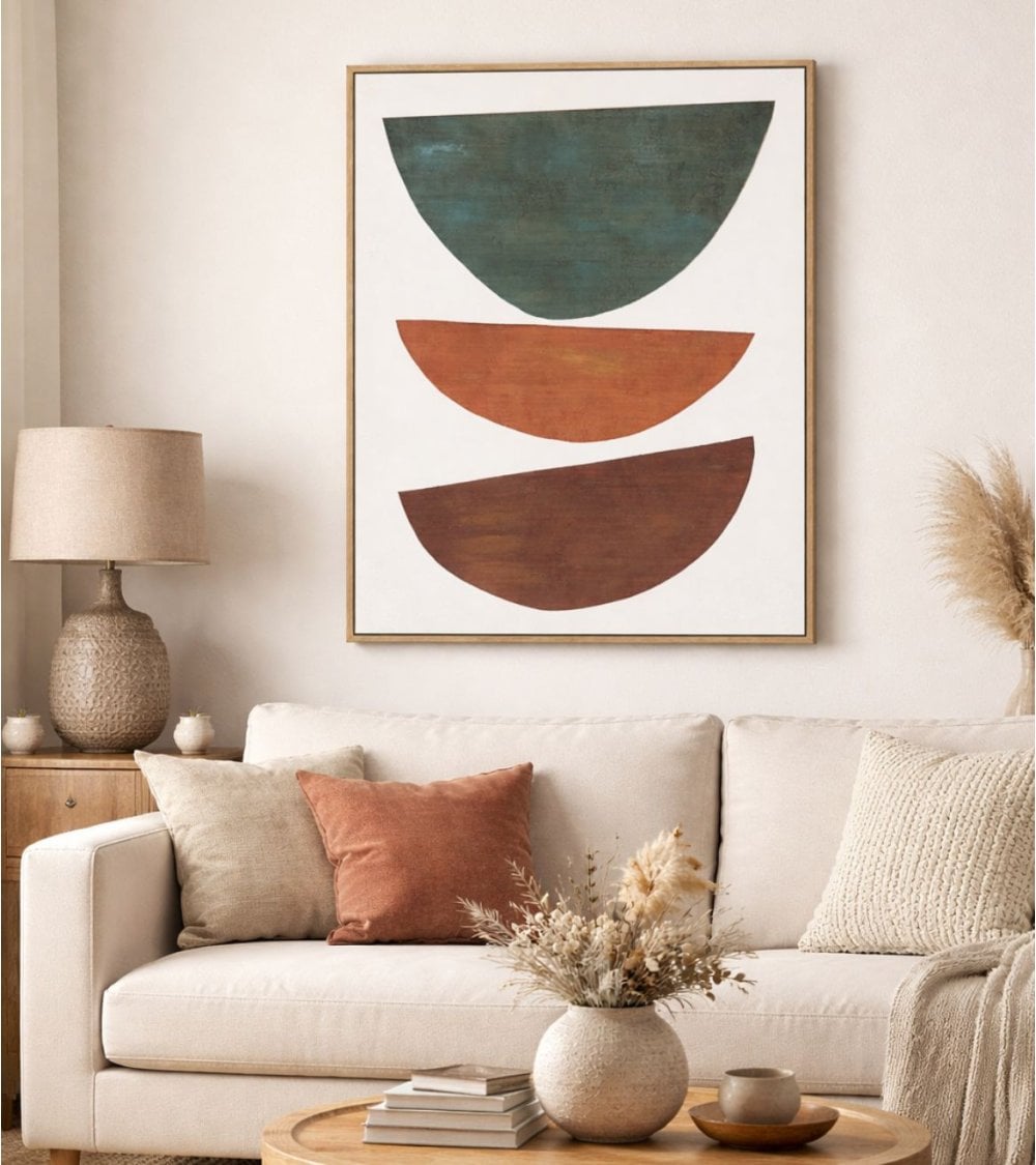 El diseño se compone de tres semicírculos abstractos apilados verticalmente, cada uno con un color cuidadosamente seleccionado para crear un contraste visual atractivo y equilibrado. La parte superior presenta un semicírculo invertido en tono verde azulado profundo, seguido por uno en terracota cálido, y finalmente, el semicírculo inferior en un granate oscuro y terroso. Estos colores resaltan sobre el fondo neutro crema, permitiendo que el cuadro se convierta en el punto focal de cualquier habitación.