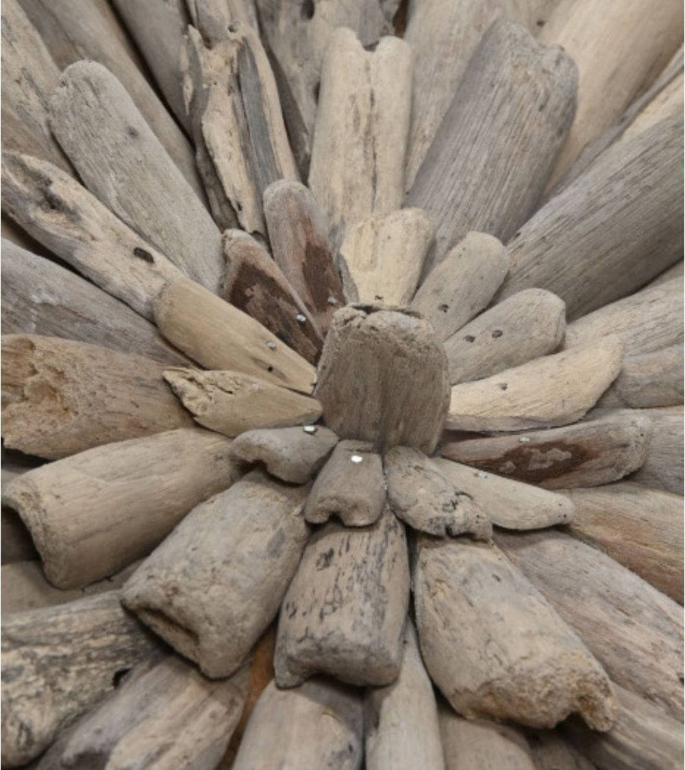 - Diseño radial decorativo con pequeñas piezas de madera que generan volumen y textura.