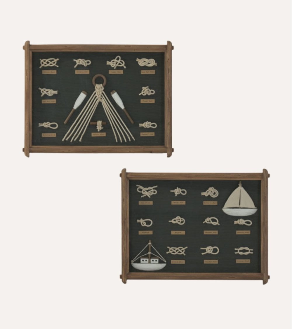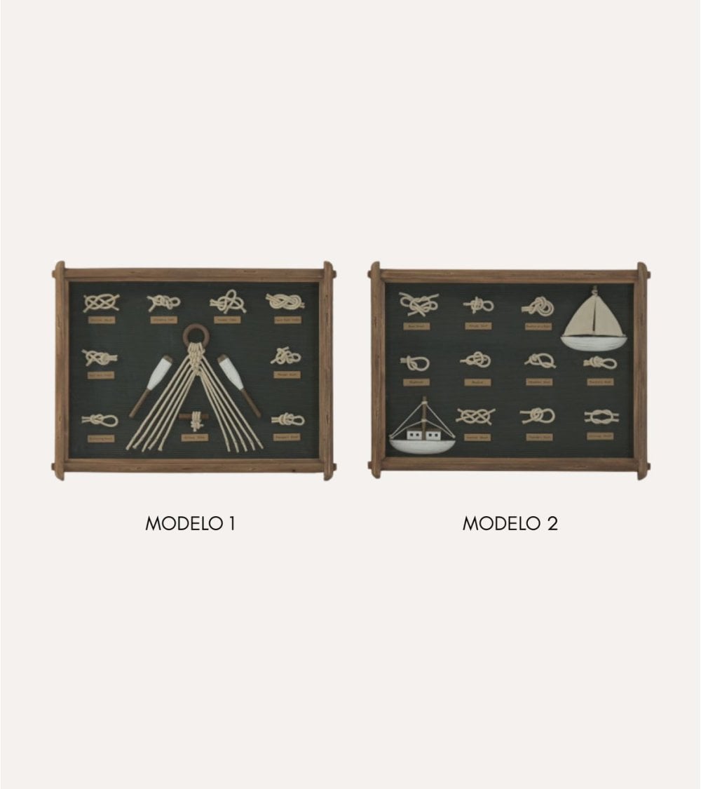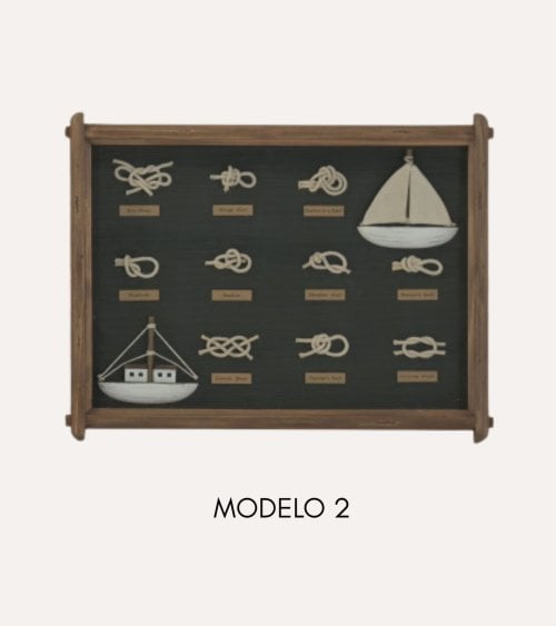 Este cuadro decorativo de nudos marineros, hecho de madera de pino de alta calidad, aporta un contraste entre la calidez de la madera y la profundidad de los tonos marinos. Su versatilidad lo hace perfecto para combinar con muebles en tonos neutros, mimbre, fibras naturales o acabados metálicos. El cristal frontal protege los elementos interiores del polvo y la humedad, alargando la vida útil del cuadro y conservando su apariencia original. Sus medidas son 59 x 4 x 45 cm y está disponible en colores verde y azul. Su estilo náutico con detalles marinos lo hace perfecto para la categoría de cuadros de decoración.