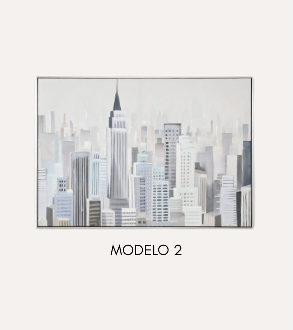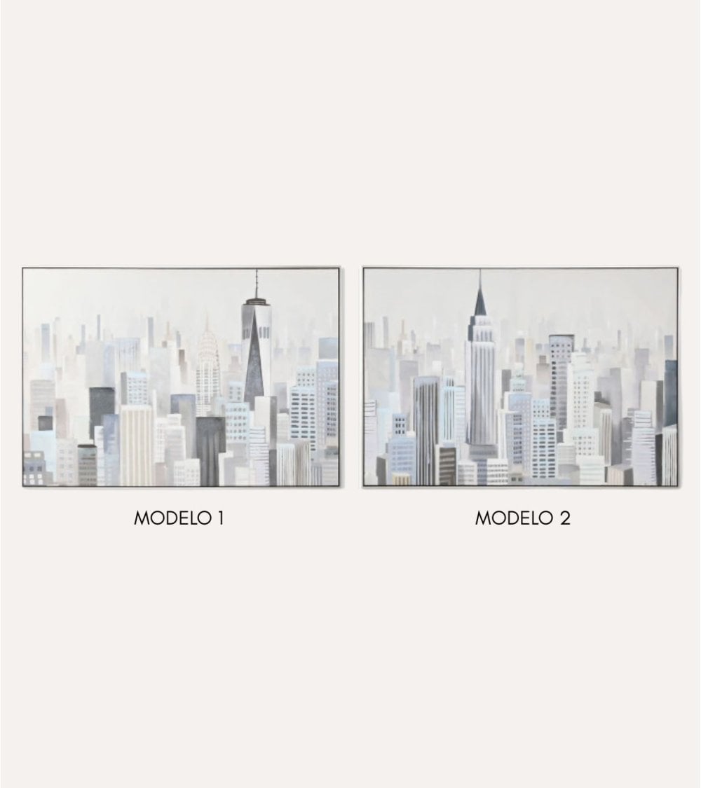 Este cuadro está disponible en dos modelos distintos, cada uno representando un paisaje urbano único. El Modelo 1 destaca por su composición densa y detallada, mostrando una variedad de edificios altos y un icónico torreón central que aporta profundidad y carácter a la obra. Por otro lado, el Modelo 2 ofrece una interpretación más espaciosa del skyline, resaltando un rascacielos emblemático en el centro y tonos ligeramente más cálidos que aportan contraste visual sin perder la armonía general.