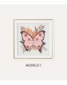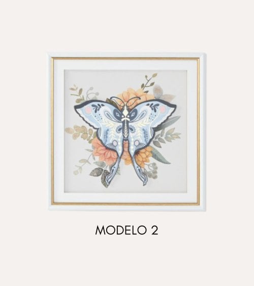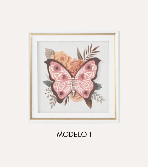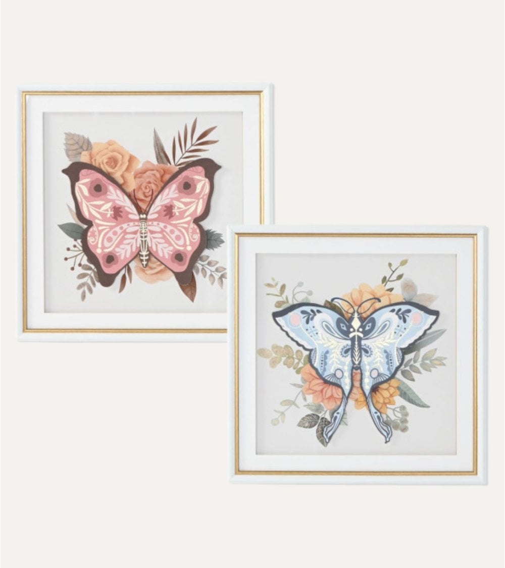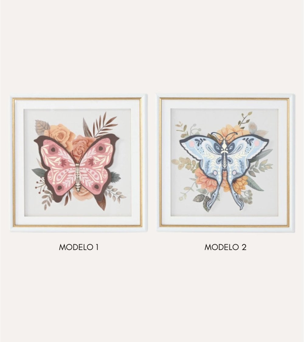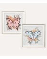 Los motivos de mariposa son el punto focal de cada cuadro. A la izquierda, una mariposa en suaves tonos rosa se destaca con acentos más oscuros, mientras que a la derecha, una mariposa en una paleta azul ofrece un contraste cautivador. Ambas están rodeadas por elementos florales como rosas y hojas verdes, que complementan perfectamente su estética.