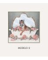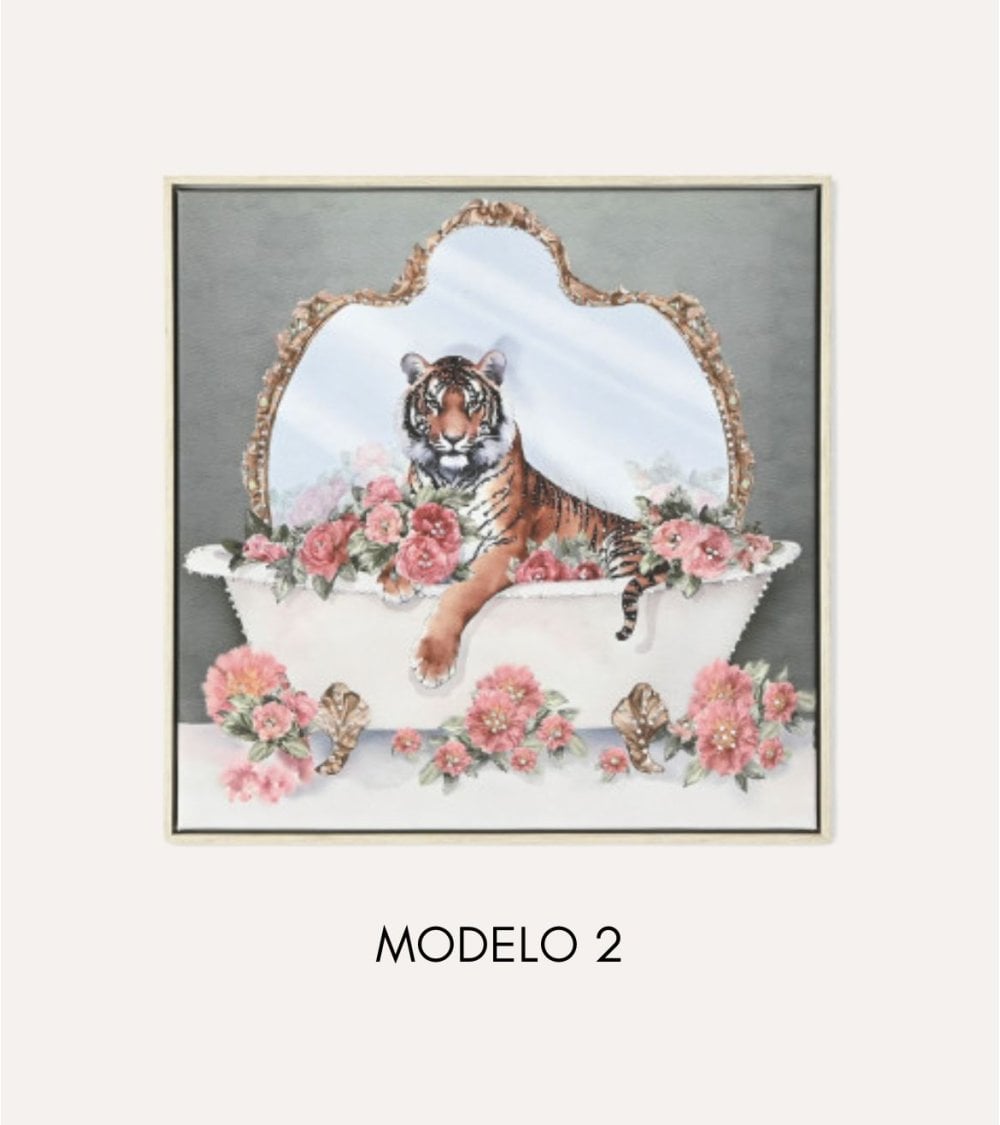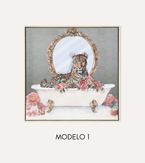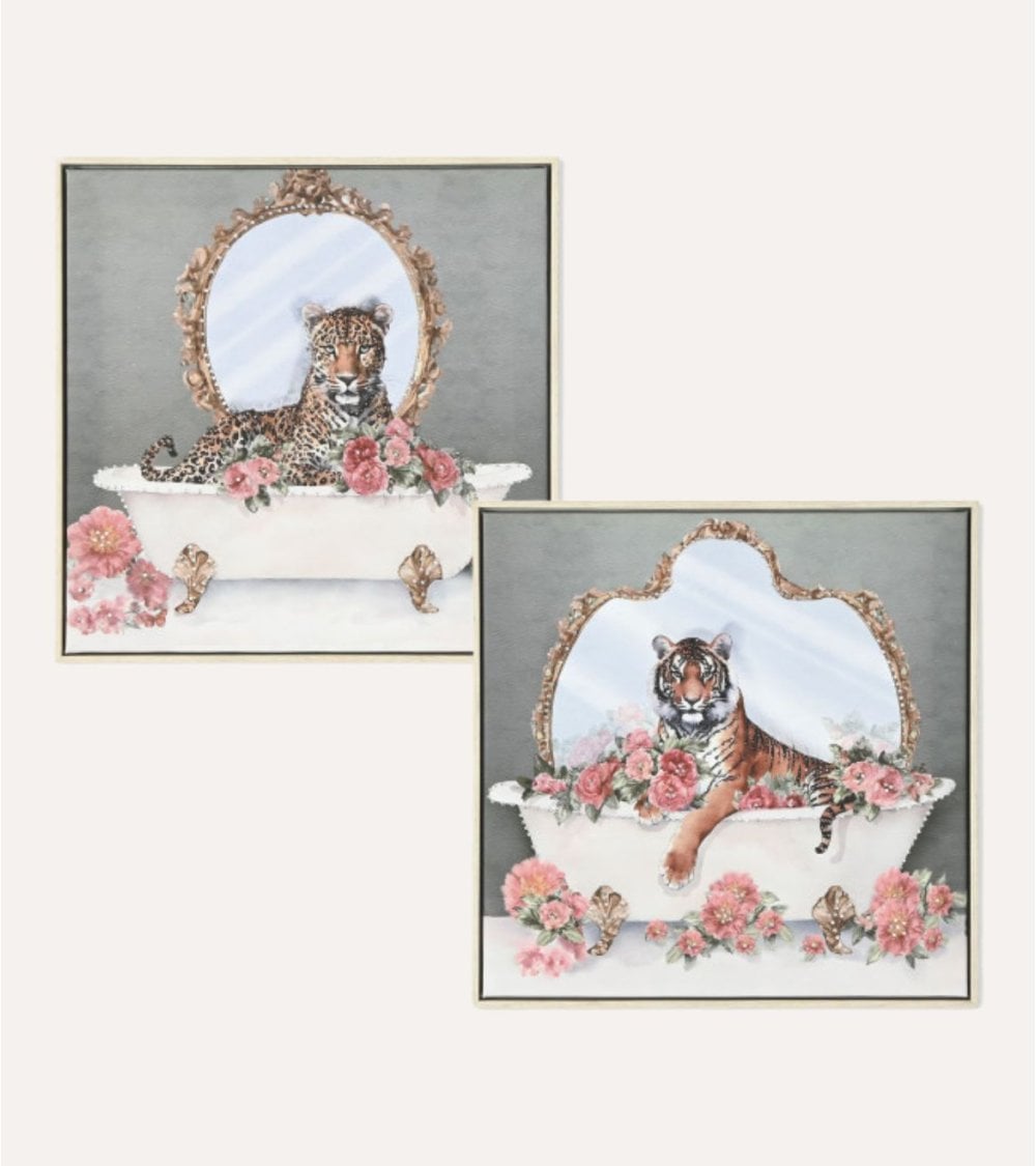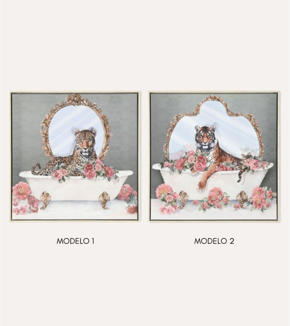 Cada impresión muestra un bañera vintage como elemento central, donde un majestuoso leopardo y un impresionante tigre se relajan en un entorno decorado con flores delicadas. La paleta de colores suaves, que incluye tonos pastel y un fondo gris sutil, realza la belleza natural de estos grandes felinos, haciendo que cada pieza sea perfecta para cualquier decoración.