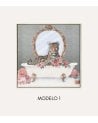 - Diseño Elegante: Presenta una bañera vintage adornada con detalles dorados.