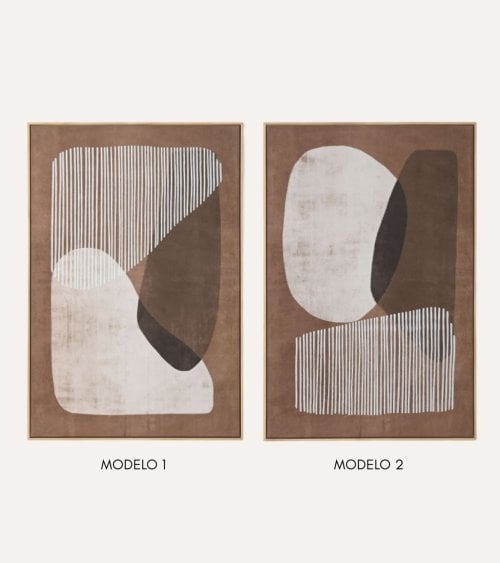 Este cuadro lienzo Shades de Madera, elaborado con lienzo de alta calidad y enmarcado en madera, garantiza durabilidad y un acabado elegante. Con un tamaño de 83 x 4.3 x 123 cm, ofrece dos modelos. El modelo 1 presenta un fondo marrón cálido con formas abstractas, incluyendo una gran forma ovalada blanca y líneas verticales contrastantes. El modelo 2, similar al primero, incorpora una figura negra junto a formas redondeadas blancas, manteniendo la cohesión estética. Este cuadro es perfecto para estilos contemporáneos, escandinavos o eclécticos, ideal para salas de estar, dormitorios u oficinas.
