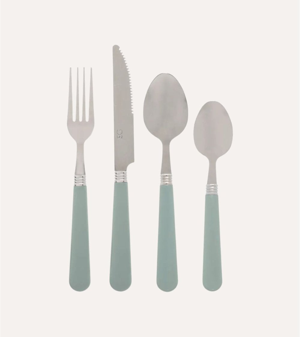Con un diseño contemporáneo, cada pieza está pensada para complementar cualquier ocasión, ya sea una cena familiar o un picnic al aire libre. La combinación del acero pulido con los mangos en colores suaves como gris, verde, rojo, y blanco, aporta un estilo fresco y atractivo a tu mesa.
