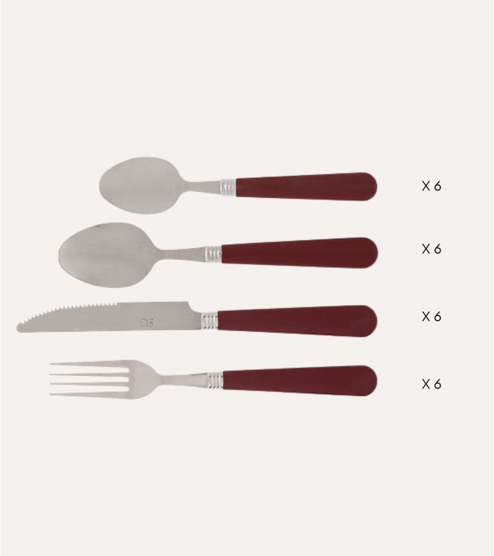 - Incluye: cucharita, cuchara sopera, cuchillo y tenedor.