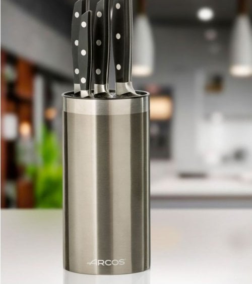Fabricado con acero inoxidable de alta calidad, este soporte es conocido por su durabilidad y resistencia a la corrosión. Su diseño cilíndrico y compacto lo hace ideal para cualquier encimera, permitiendo un fácil acceso a tus cuchillos más utilizados. Con unas dimensiones de 11 x 11 x 20 cm, se adapta perfectamente a diferentes tamaños de cuchillos.