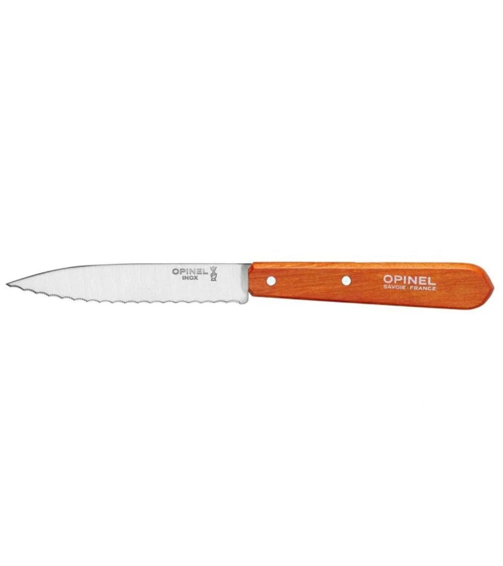 El Cuchillo Dentado Nº 113 de Opinel es ideal para cortar fruta, verdura y salchichones gracias a su hoja microdentada eficaz. Este cuchillo cuenta con un mango de haya barnizado, resistente al agua y las manchas, disponible en color natural, verde, naranja y rosa fucsia. Un utensilio imprescindible en tu cocina.