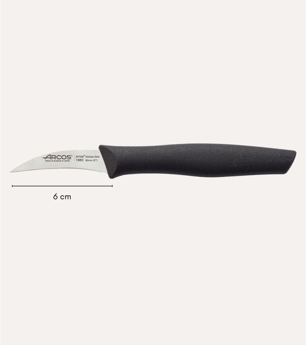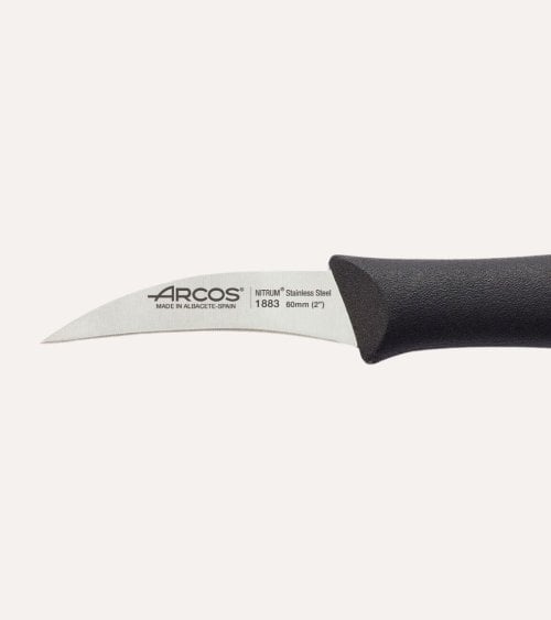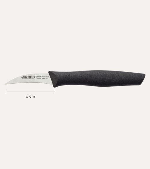 La cuchilla está hecha de Acero Inoxidable NITRUM®, lo que garantiza su durabilidad y resistencia a la corrosión. Con una longitud de 10 cm, su forma curva es ideal para tareas como pelar frutas y verduras, así como para cortes precisos en ingredientes delicados.