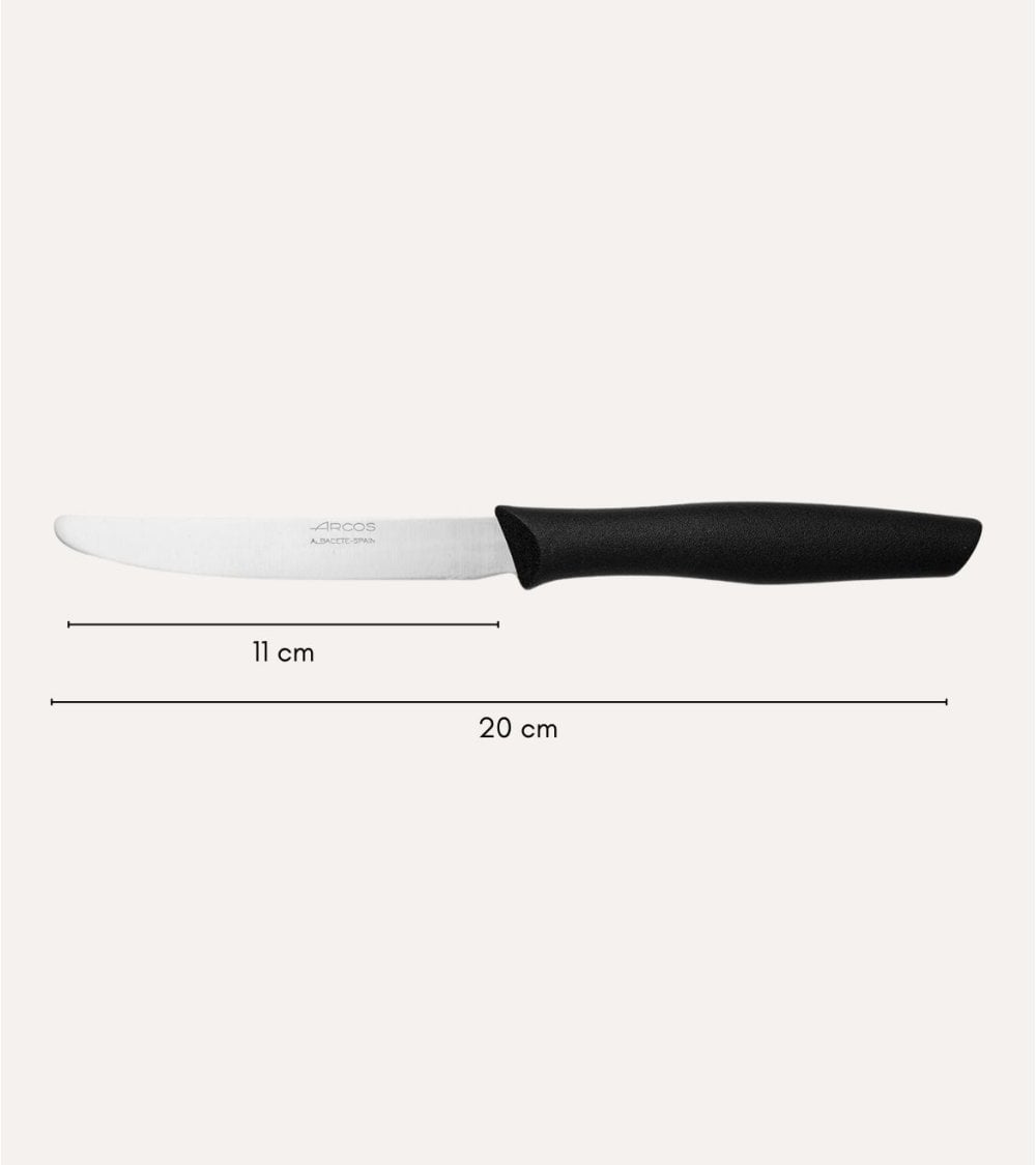 Descubre la elegancia y funcionalidad del Set de 6 Cuchillos de Mesa Genova de Acero Inoxidable, una obra maestra de Arcos. Fabricados con Acero Inoxidable NITRUM®, estos cuchillos ofrecen mayor dureza y poder de corte, garantizando la durabilidad del filo. Su apariencia elegante con hojas pulidas aporta un toque moderno a tu mesa. Los mangos ergonómicos de material polimérico negro aseguran un manejo cómodo. Con un tamaño ideal de 20 cm, son fáciles de mantener, aptos para lavavajillas aunque se recomienda lavado a mano para preservar su brillo.