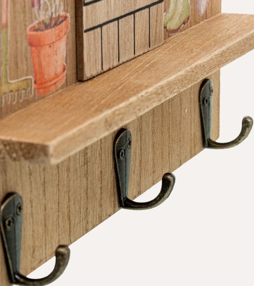 Este Cuelga Llaves de Casita de Campo de Madera es un accesorio imprescindible para su hogar. Con 3 ganchos para llaves, este organizador de madera mantiene sus llaves en un solo lugar. Su diseño tierno y rústico añade un toque de encanto a cualquier espacio. Sus medidas son 20 x 4 x 30 cm, perfecto para cualquier pared.