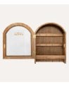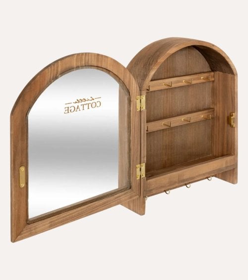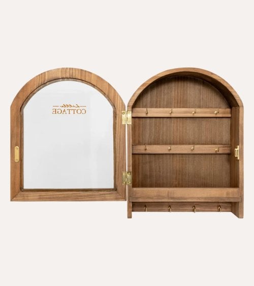 Fabricado con madera de alta calidad y un panel frontal de vidrio, el Cuelga Llaves destaca por su durabilidad y atractivo estético. La madera presenta un acabado natural que resalta la textura y el grano, mientras que el cálido tono marrón claro se integra perfectamente en diversos estilos de decoración.