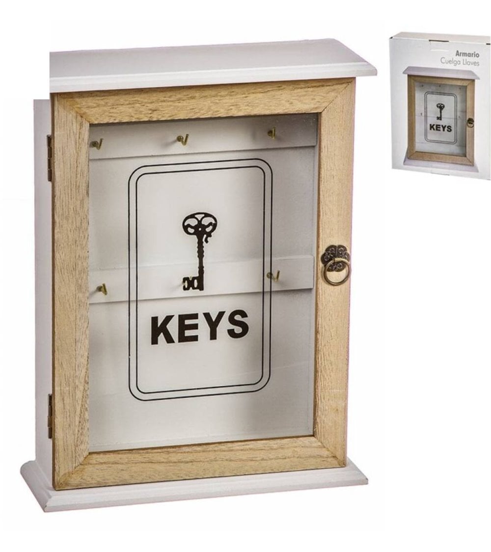 Colgador para llaves con puerta de cristal con palabra “keys”, cuerpo de madera de MDF con capacidad para seis juegos de llaves.