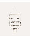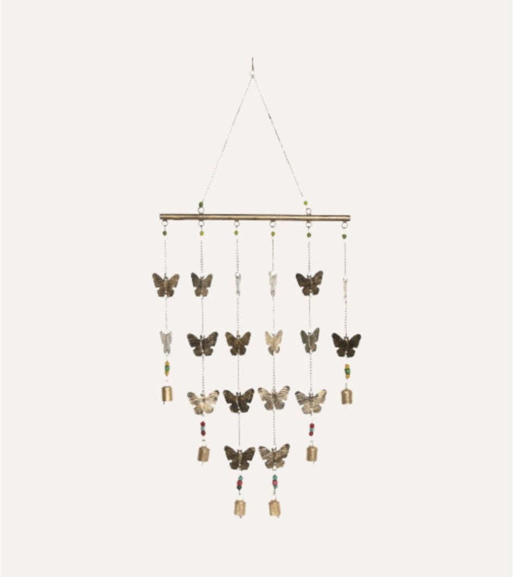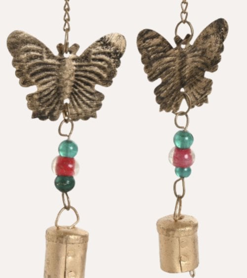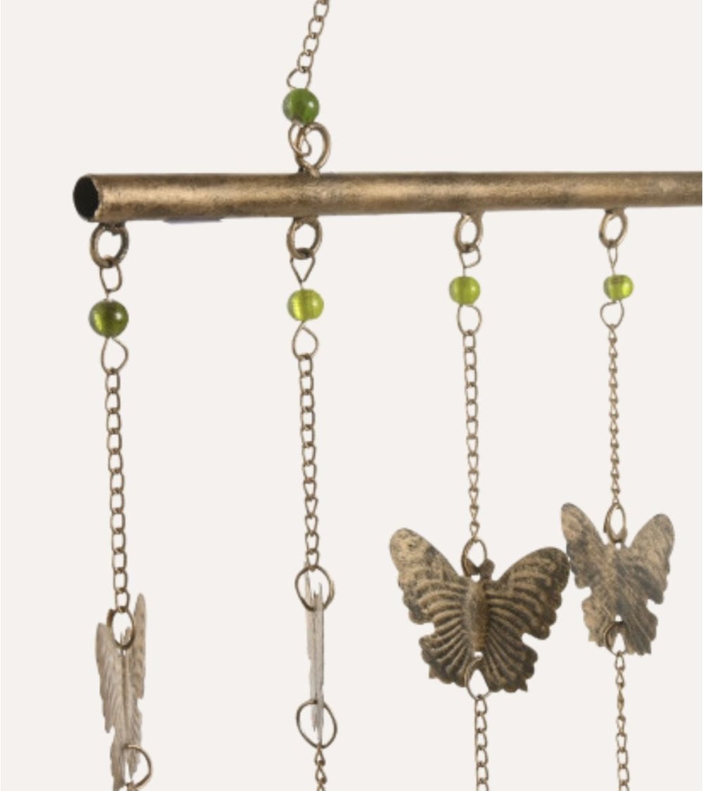 Este colgante no solo es visualmente atractivo sino también funcional, ya que su tamaño mediano lo hace adecuado para diversos espacios sin sobrecargarlos. Además, incorpora pequeños elementos decorativos como cuentas y pendientes entre las mariposas, hechos en vidrio o madera pintada, añadiendo textura y profundidad a la composición.