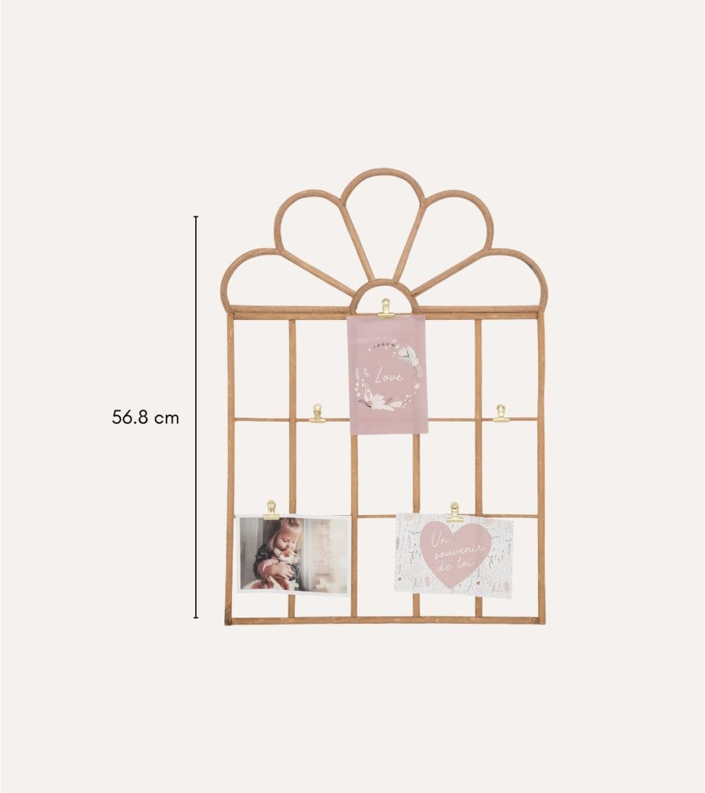 Su estructura tipo ventanal con rejilla permite sujetar fácilmente varias imágenes mediante pequeñas pinzas o clips, creando una galería personalizada que crecerá junto con el niño o la niña. Gracias al acabado en tono madera clara, esta decoración infantil encaja a la perfección en habitaciones de estilo nórdico, boho, Montessori o natural, aportando calidez sin recargar el ambiente.