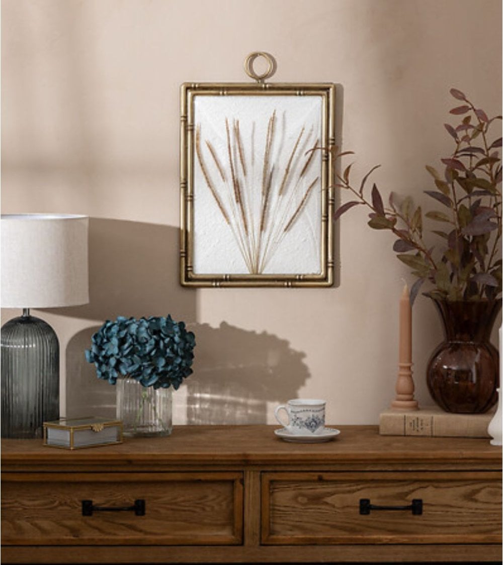 Dentro del marco, encontrará elementos botánicos o hierbas secas que añaden un toque natural a su decoración. Este arte natural no solo embellece el entorno, sino que también puede convertirse en el punto focal perfecto para su sala de estar, dormitorio u oficina.
