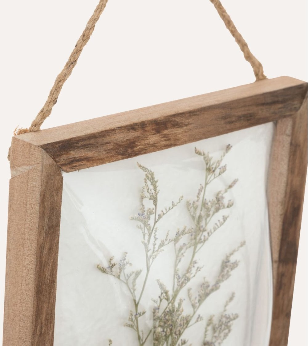 El fondo suave y neutral del marco contrasta maravillosamente con los tonos sutiles de las flores prensadas, creando un equilibrio visual armonioso. Esta pieza no solo es perfecta para embellecer tu hogar, sino también como un regalo considerado para los amantes de la naturaleza.