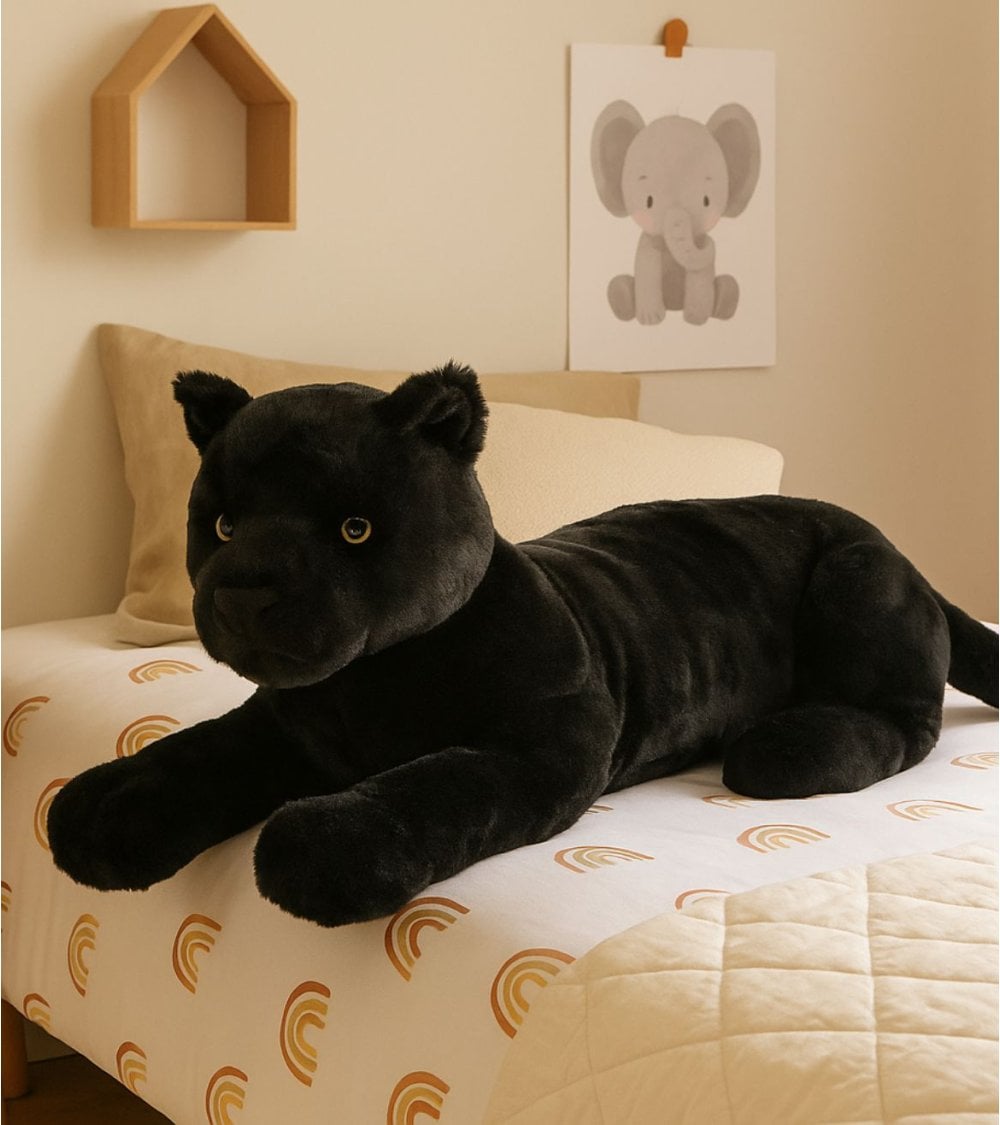 Fabricada con poliéster de alta calidad, esta pantera negra ofrece una sensación aterciopelada que invita a abrazarla. Su color negro intenso con sutiles sombras aporta profundidad y realismo, haciendo que este peluche sea una pieza destacada dentro de la categoría decoración infantil. Además, su tamaño es ideal para adaptarse a diferentes espacios: mide 23 x 16 x 70 cm, lo que permite colocarla fácilmente sobre camas, estanterías o rincones especiales.