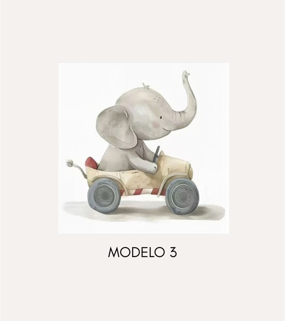 Este cuadro está inspirado en tres modelos únicos que representan coches con simpáticos animalitos: una jirafa vintage, un león en coche naranja y un elefante alegre. Cada diseño está cuidadosamente ilustrado para estimular la imaginación de los niños, creando un espacio lleno de color y ternura. La paleta suave y los detalles caricaturescos hacen que este cuadro sea perfecto para habitaciones infantiles o áreas de juego.