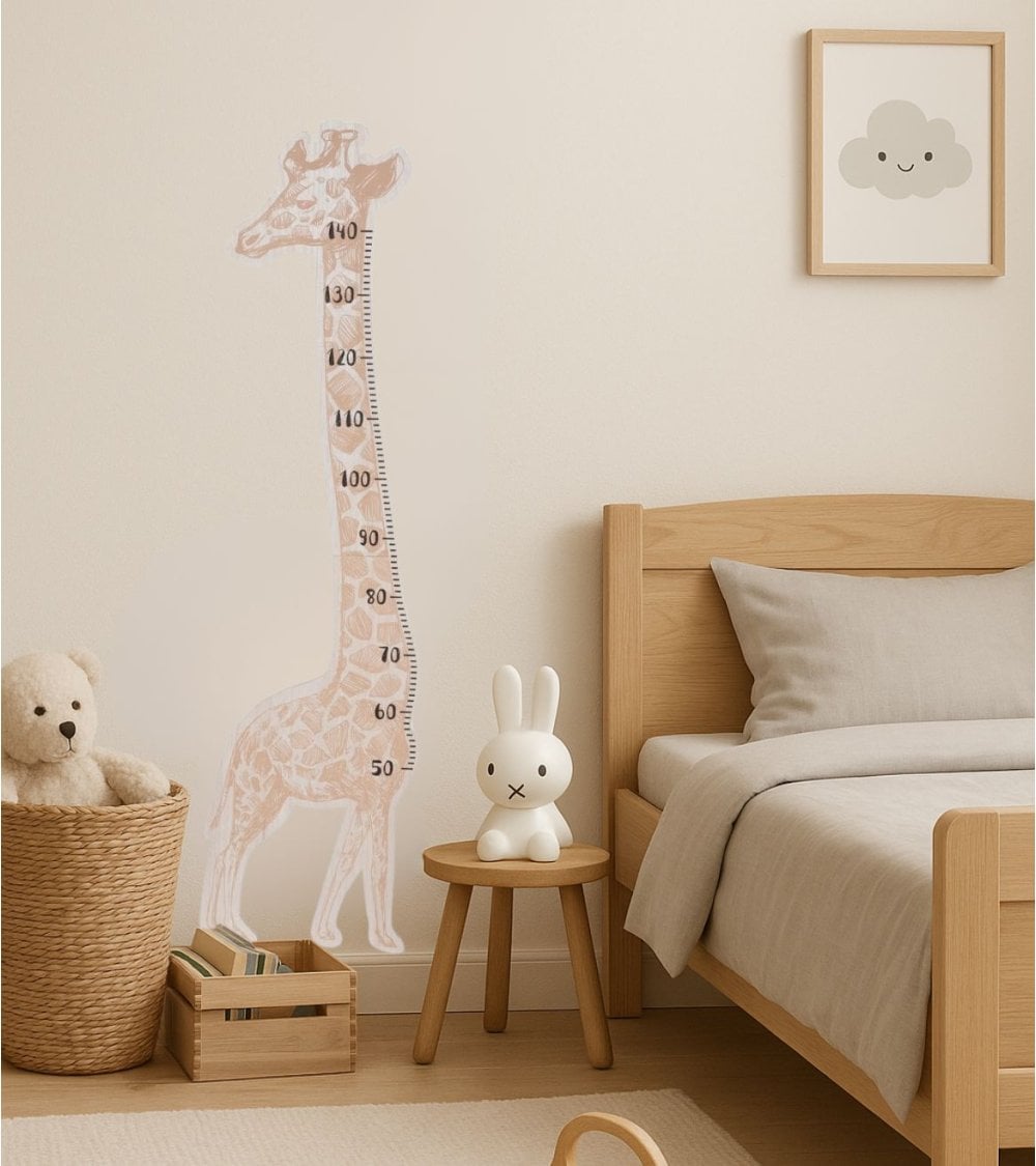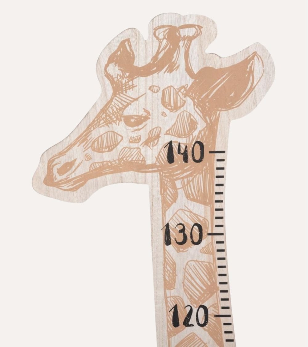 Fabricado en MDF, este medidor ofrece una estructura resistente y duradera, ideal para colgar en la pared sin preocuparte por su desgaste. Su diseño en forma de jirafa, con tonos beige suaves y detalles en marrón que imitan las manchas características del animal, crea un ambiente cálido y acogedor para los niños.