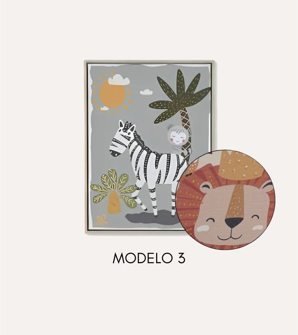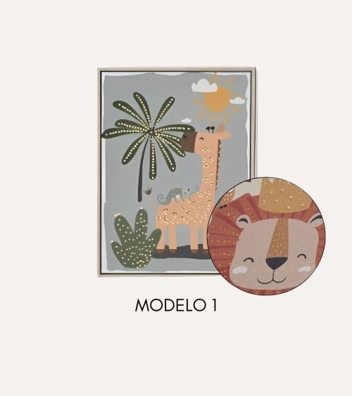 El Cuadro Infantil Safari Brillante es una pieza de decoración única que aportará un toque de alegría y diversión a la habitación de tus pequeños. Este cuadro, con su diseño de safari y sus brillantes incorporados, es perfecto para estimular la imaginación de los niños y hacer que su habitación sea un lugar más alegre y colorido.