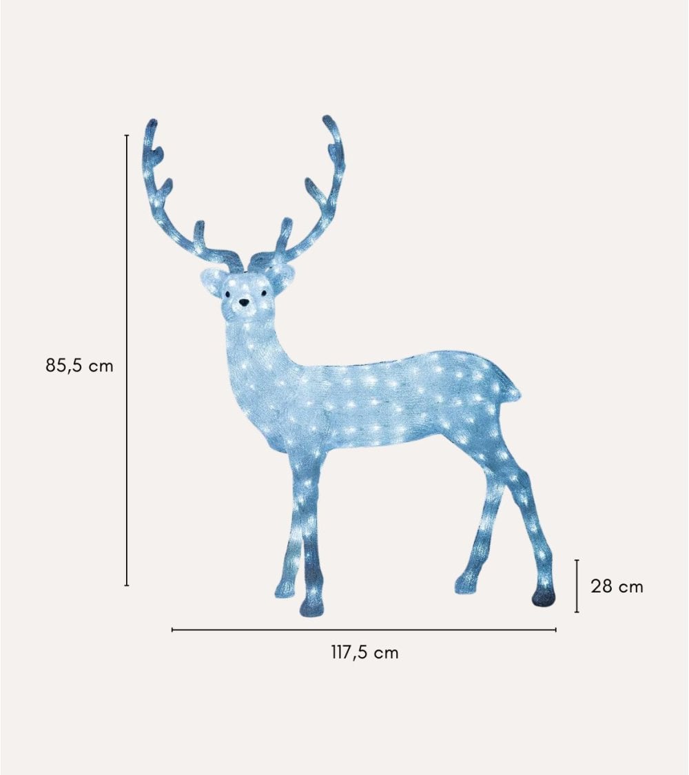 Fabricado con materiales resistentes como metal y poliestireno, este reno está diseñado para soportar las condiciones climáticas del exterior, garantizando durabilidad y un uso prolongado año tras año. Su estructura robusta mantiene la forma perfecta mientras que su acabado en tonos azulados aporta un toque invernal y sofisticado a cualquier ambiente.