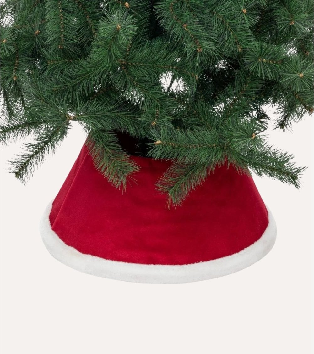 Fabricada con materiales de alta calidad como poliéster y cartón resistente, esta base es ligera pero robusta, ideal para sostener árboles de tamaño pequeño a mediano. Su diseño único emula el tradicional gorro rojo de Papá Noel, con detalles en blanco que aportan ese aire clásico y alegre que todos asociamos con las fiestas decembrinas.