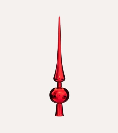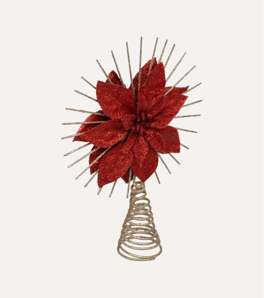 Fabricada en plástico resistente, esta punta de árbol destaca por su acabado brillante y duradero, que garantiza una larga vida útil temporada tras temporada. Su diseño simula una flor estilizada, similar a una poinsettia, con pétalos rojos cubiertos por un delicado brillo que captura la luz y aporta calidez a cualquier ambiente.