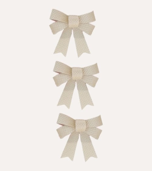 El diseño simétrico de cada lazo incluye dos amplios bucles superiores con una textura ligeramente ondulada que aporta volumen y elegancia. Debajo, se extienden dos colas terminadas en punta que completan su forma clásica. Su tamaño compacto los hace versátiles para múltiples usos sin sobrecargar visualmente el espacio.