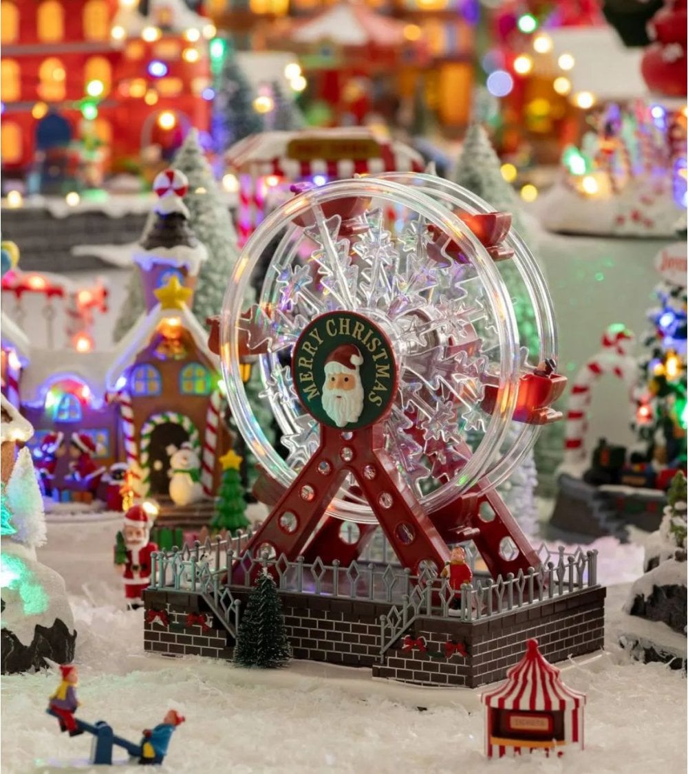 Además, alrededor de la base encontrarás una pequeña cerca blanca junto a figuras miniatura como Santa Claus y su perro, así como un árbol de pino pequeño que complementa el ambiente navideño. La noria gira suavemente gracias a su mecanismo integrado mientras se iluminan las luces LED sincronizadas con música tradicional navideña.