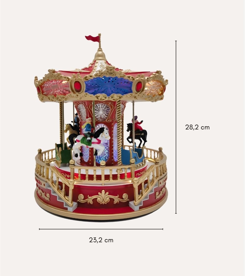 Fabricada en poliresina, este tiovivo decorativo destaca por su resistencia y acabado detallado, ideal para mantener su belleza a lo largo del tiempo. Su diseño colorido y festivo incluye un base circular en rojo intenso con detalles dorados que aportan elegancia, mientras que el techo presenta tonos azulados y blancos con remates dorados y una pequeña bandera roja en la cima, evocando la nostalgia de los carruseles clásicos.