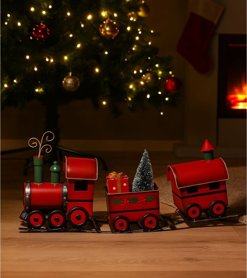 El diseño incluye tres componentes principales: la locomotora, el vagón de carga y el furgón final o caboose, todos pintados en un vibrante color rojo con detalles en verde y plateado que resaltan su estilo navideño. La locomotora presenta una forma tradicional con chimenea y ruedas negras bien definidas, mientras que el vagón transporta una pequeña árbol de Navidad artificial junto a regalos envueltos, decorados con motivos de acebo para aumentar su encanto festivo. El caboose mantiene la armonía del conjunto con su techo puntiagudo y acabados dorados.