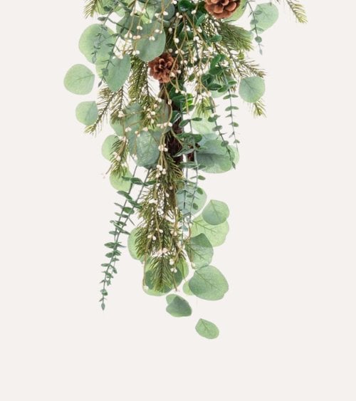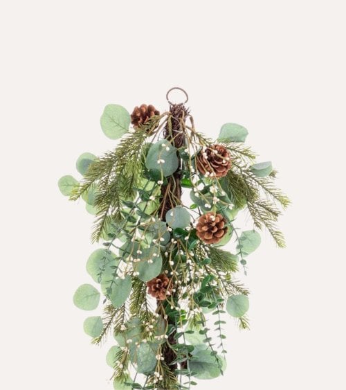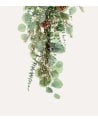 La rama decorativa está diseñada con un efecto cascada que aporta dinamismo y profundidad visual a cualquier espacio. Sus hojas artificiales, principalmente de eucalipto, presentan una textura suave y formas redondeadas que imitan fielmente el follaje natural. Además, incorpora pequeños piñones que añaden un detalle rústico y auténtico, ideal para quienes buscan una decoración con estilo campestre o natural.
