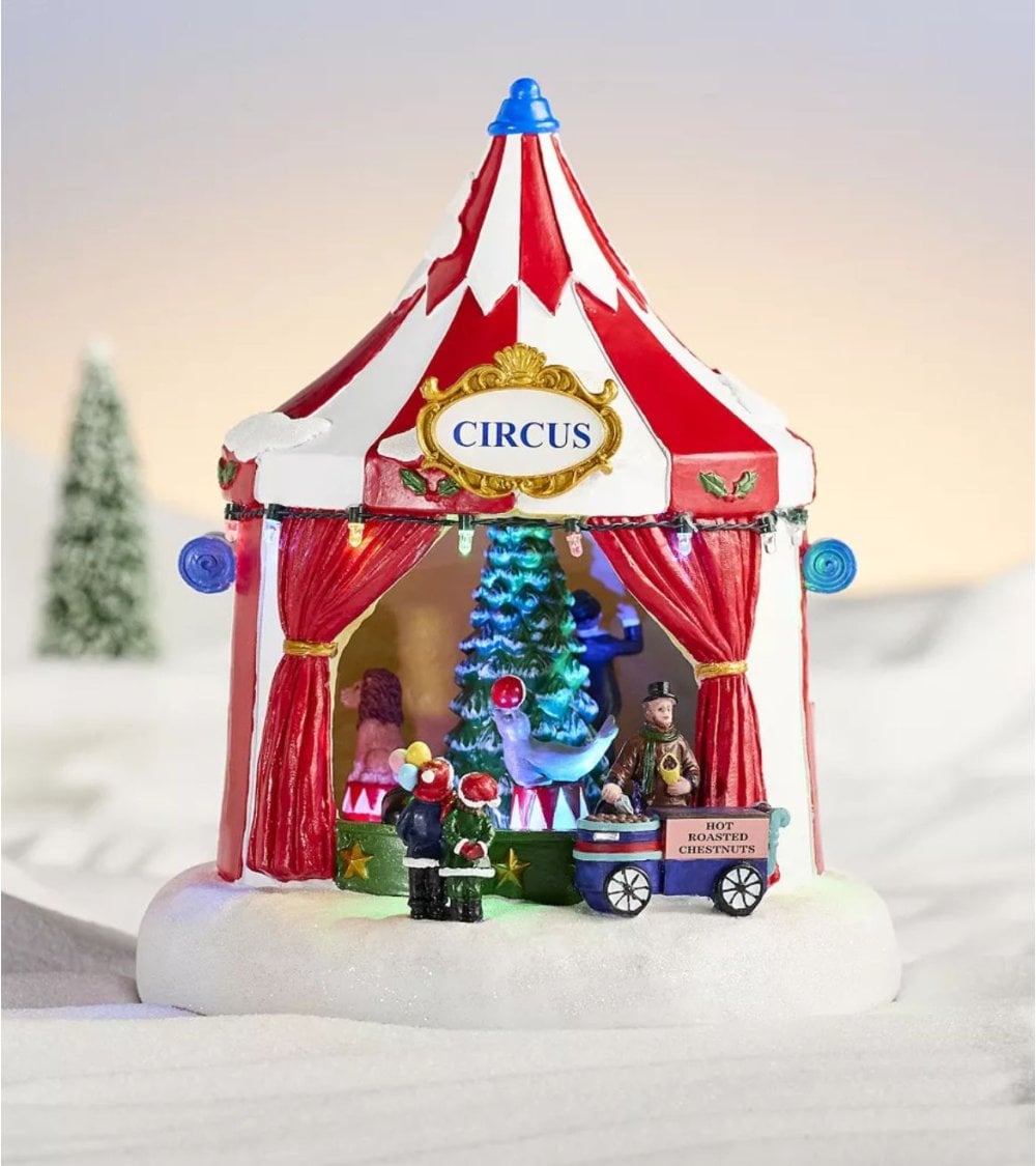 Descubre la magia de la Navidad con esta Escena Navideña de Circo con LED y Movimiento. Con medidas de 21.5 x 21.5 x 21 cm, esta carpa de circo blanca y roja se ilumina con luces LED y presenta un encantador espectáculo de actos en el circo. Un detalle perfecto para añadir un toque festivo a tu hogar.