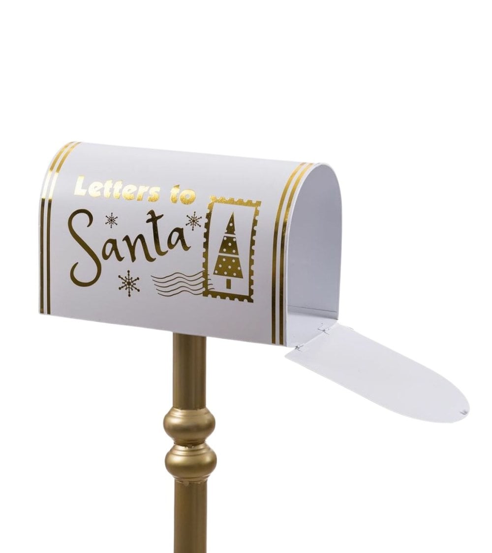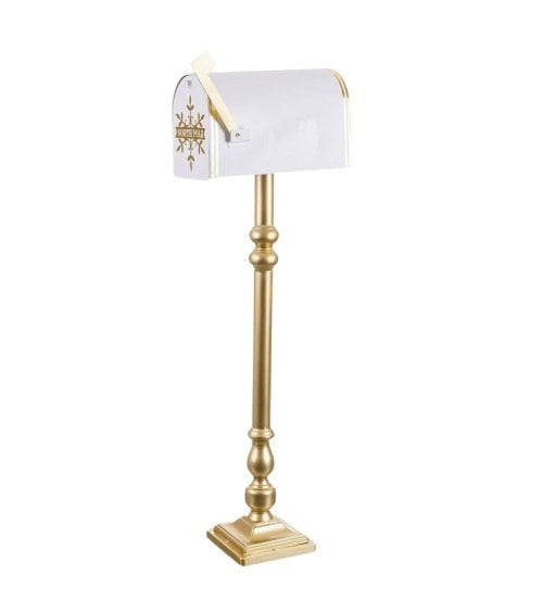 Este Buzón Decorativo Navideño Blanco de Metal, tipo americano, es perfecto para añadir un toque festivo a tu hogar. Con letras y base en dorado, este buzón de pie es ideal para que tus peques se diviertan enviando sus cartas a Papá Noel. Sus medidas son 33 x 18 x 100,5 cm, lo que lo hace lo suficientemente grande para todas las cartas de tus pequeños.