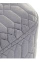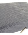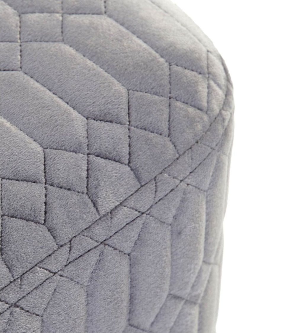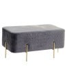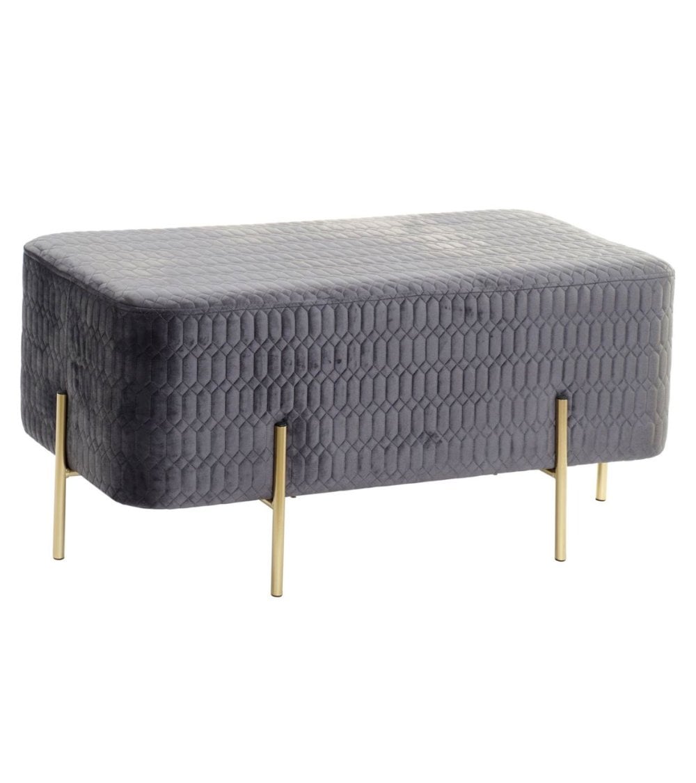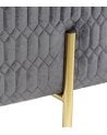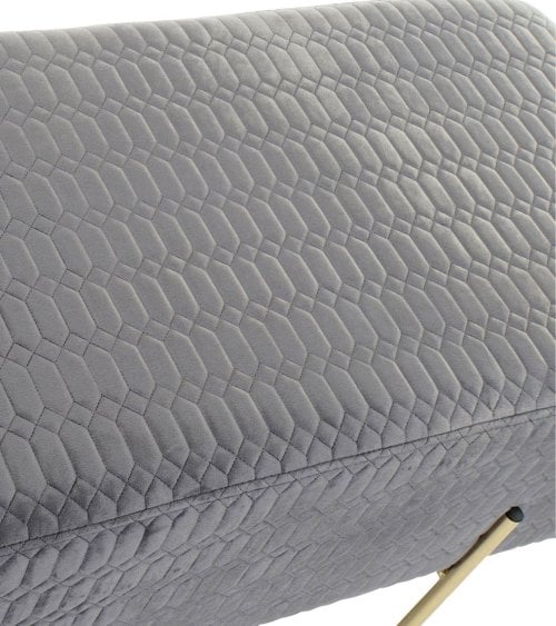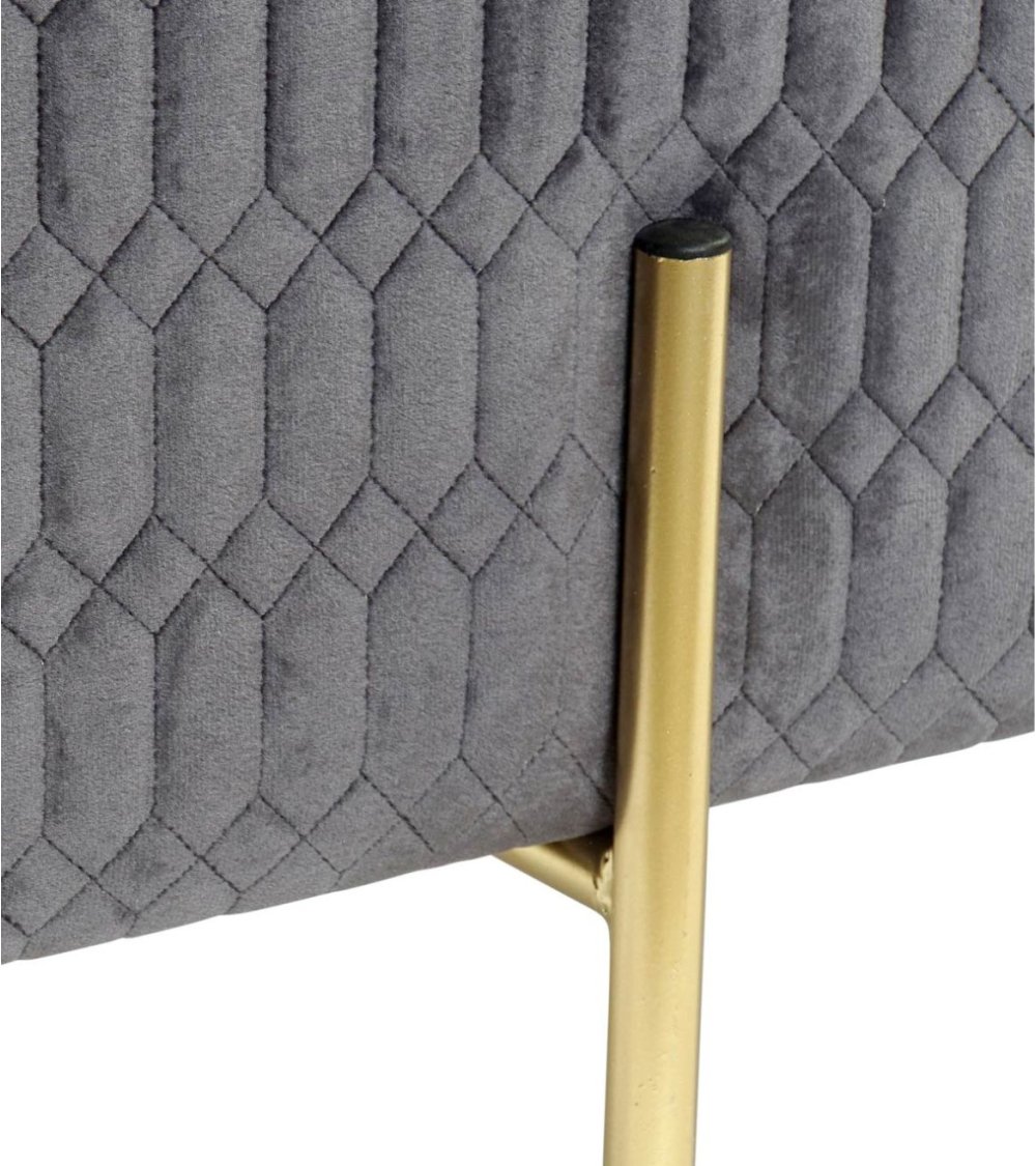 Este pie de cama cuenta con una estructura fabricada en metal en color dorado, de la que salen cuatro patas que se alargan hacia la parte superior. Su cuerpo está fabricado en poliéster efecto terciopelo en color gris, con figuras geométricas bordadas para darle un aspecto más elegante.