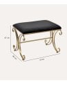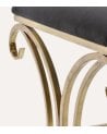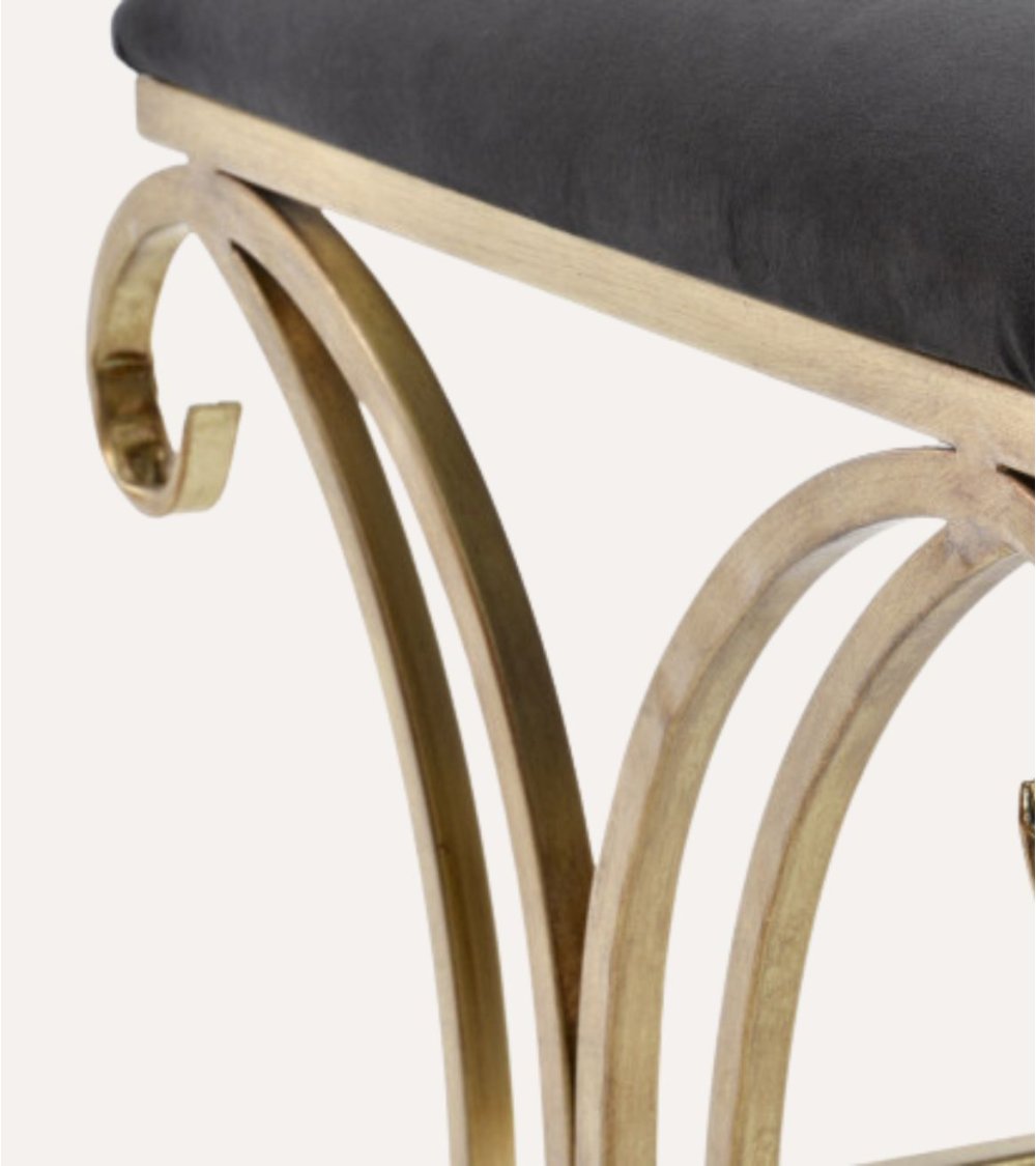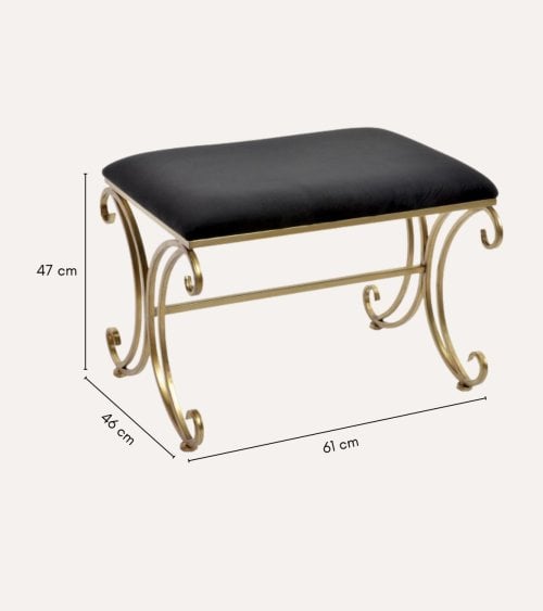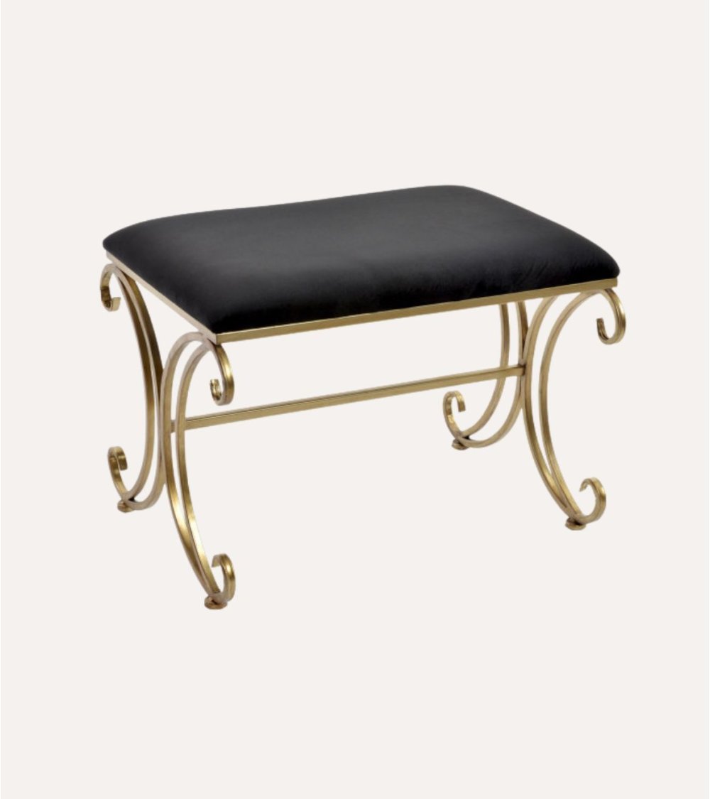 Su asiento rectangular está tapizado en un suave y lujoso terciopelo negro, que no solo ofrece comodidad sino también una textura agradable al tacto, perfecta para relajarse mientras te calzas o descansas. La estructura metálica, con acabado en un cálido tono dorado, aporta resistencia y elegancia gracias a sus curvas elaboradas y detalles en forma de volutas que realzan su diseño.