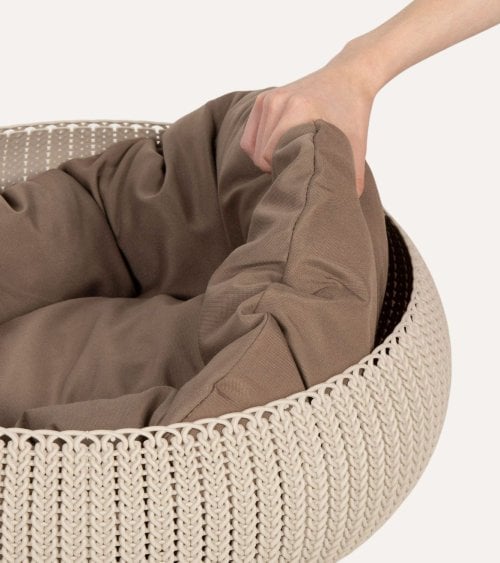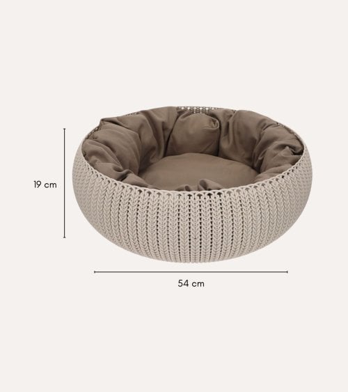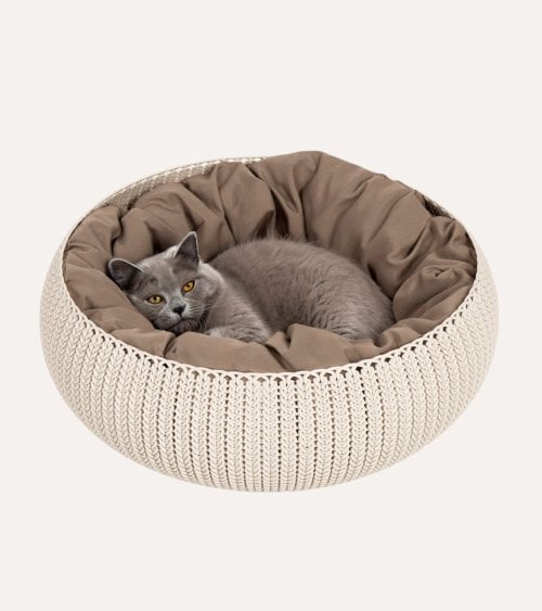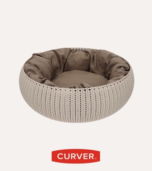 Aparte de ser funcional, la Cama Knit para Mascotas con Cojín destaca por su diseño moderno. Este producto está marcado con el logo de Curver, asegurando calidad y estilo en cada detalle. Es una opción excelente para quienes desean combinar estética y comodidad en los accesorios de sus mascotas.
