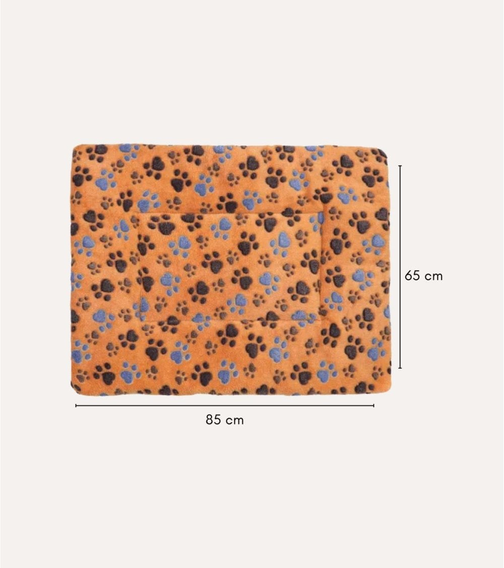 El color base de la cama es un cálido naranja que evoca los tonos del otoño, mientras que el divertido patrón de huellas en marrón oscuro y azul añade un toque encantador a cualquier espacio. Esta combinación no solo es atractiva visualmente, sino que también permite a los dueños de mascotas integrar la cama en su decoración hogareña.