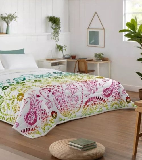 Transforma tu dormitorio en un refugio bohemio con la Colcha Bouti Evita con Diseño Hippie. Este edredón no solo es una pieza funcional, sino también un elemento decorativo que aporta un aire vibrante y alegre a cualquier espacio. Con su diseño colorido y patrones florales, esta colcha es perfecta para quienes buscan un toque de creatividad y estilo en su hogar.