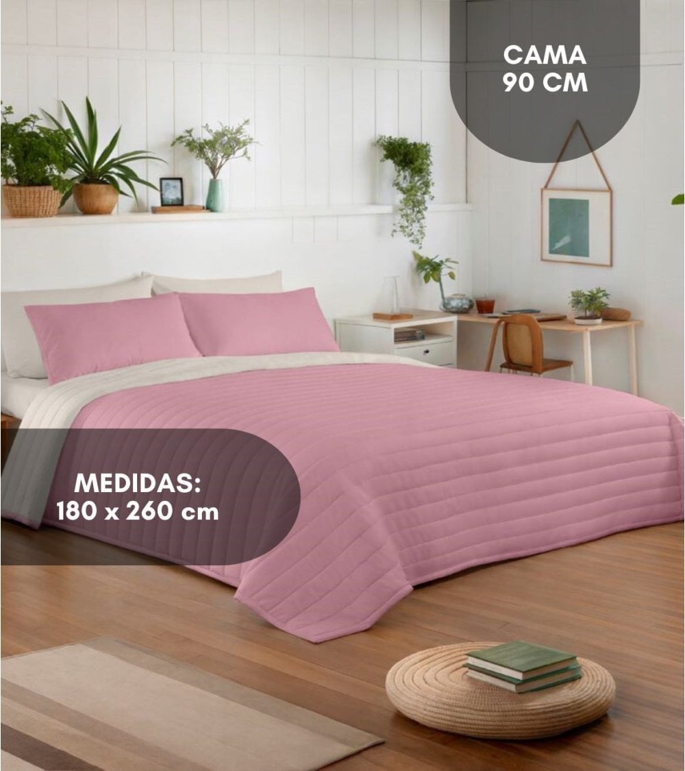 La colcha presenta un atractivo esquema bicolor: un lado en un suave color rosa, mientras que el reverso ofrece un tono neutro taupe. Esta característica reversible no solo añade funcionalidad, sino que también permite cambiar rápidamente el aspecto de tu habitación con solo darle la vuelta.