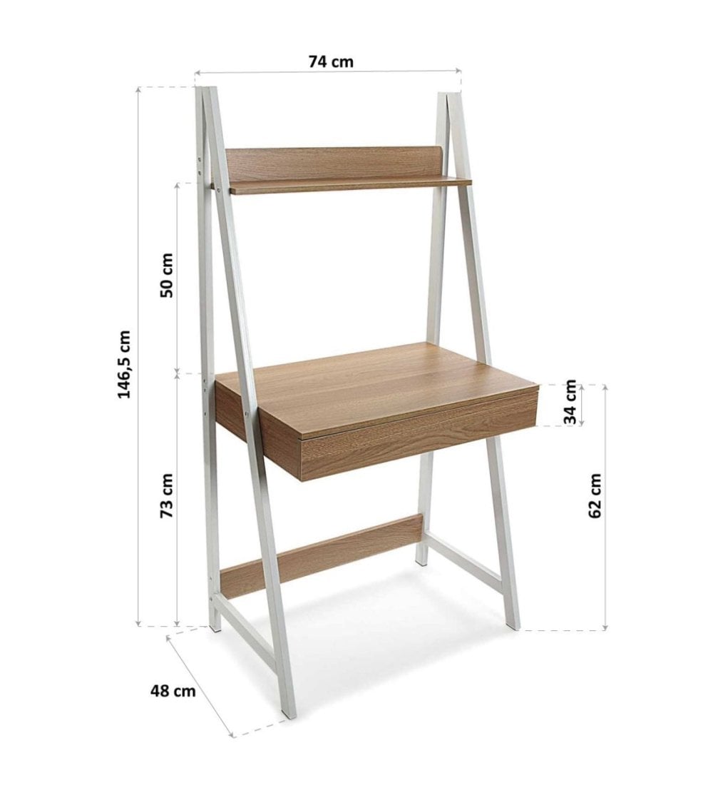 El diseño incluye una repisa superior que brinda espacio adicional para organizar libros, objetos decorativos o material de trabajo, mientras que el cajón integrado ofrece almacenamiento discreto para mantener tu área ordenada. La combinación del acabado en madera clara con líneas rectas aporta calidez y elegancia a cualquier ambiente.