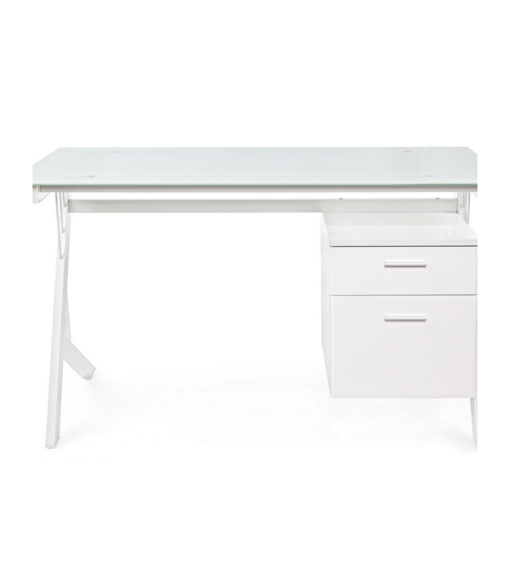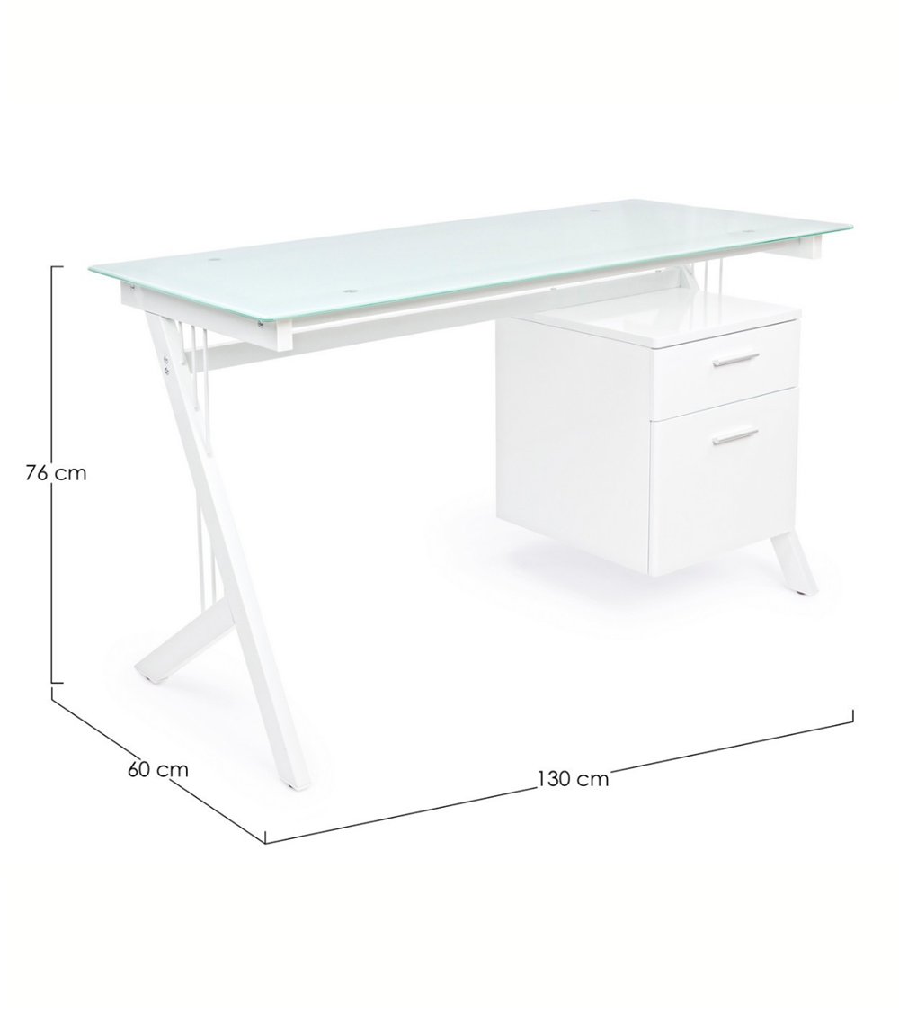 Elegante mesa de escritorio con cajonera de 2 cajones, tapa de vidrio de 8mm y estructura metálica en color blanco.