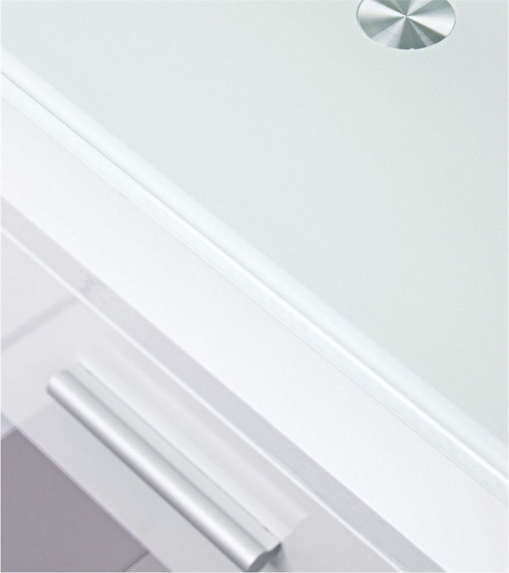 Su tablero está fabricado de vidrio templado con 8 mm de espesor, lo que le confiere una solidez y resistencia supremas. Al igual que su estructura de acero recubierto con pintura en polvo epoxídico en color blanco.