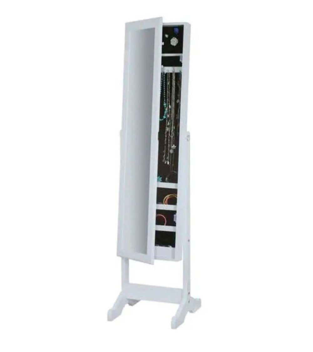 - Práctico y versátil: Con su diseño inclinable, puedes ajustar el ángulo del espejo a tu gusto. Además, su interior ofrece numerosos estantes y colgadores para organizar tus joyas.