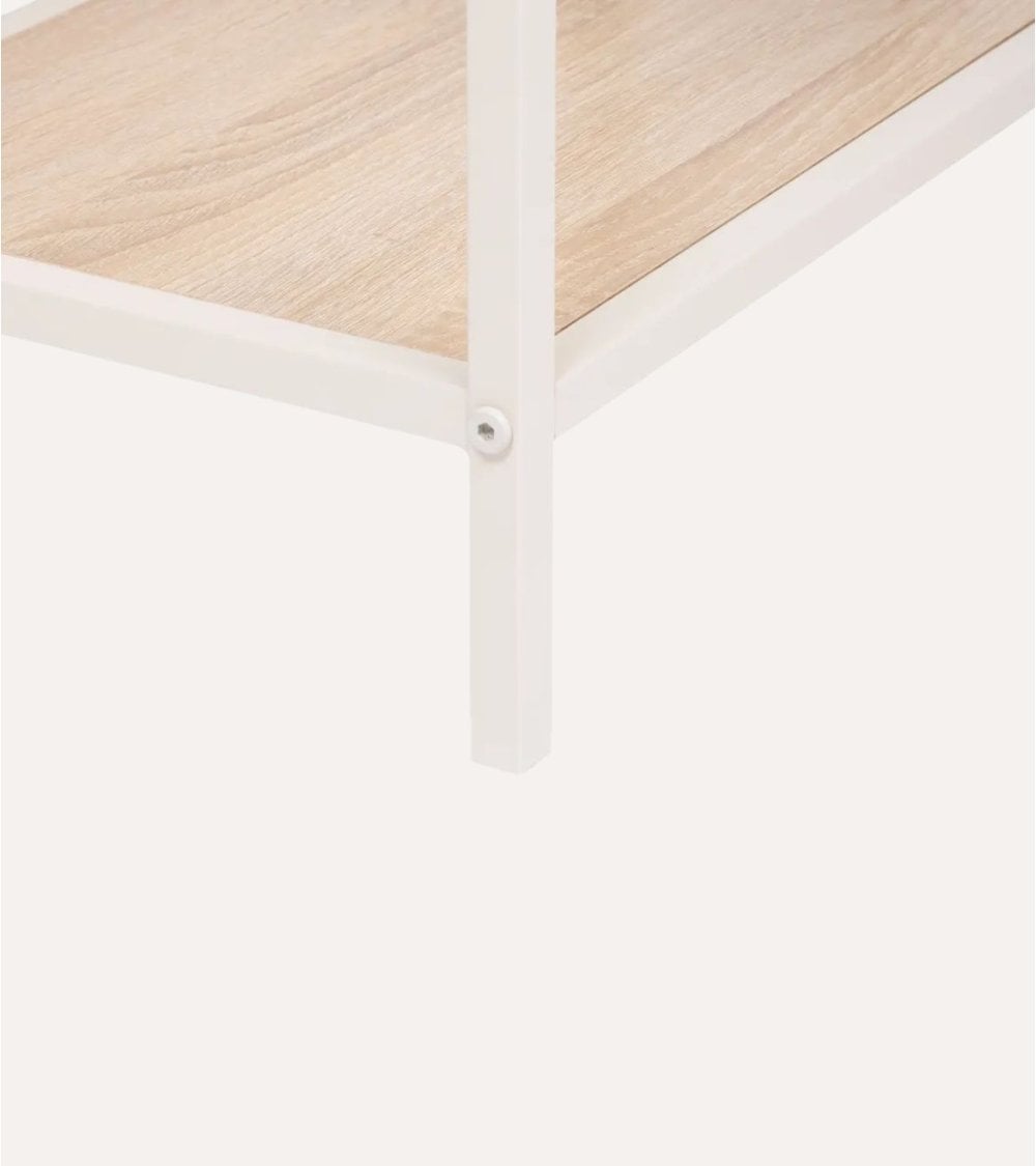 Fabricada con un resistente marco de acero acabado en un suave color blanco o crema, esta estantería ofrece una apariencia limpia y sofisticada. Sus cuatro niveles están elaborados en MDF con acabado madera clara, como roble o abedul, que añade calidez visual y contraste natural frente al metal. Gracias a su diseño abierto, permite exhibir libros, plantas o elementos decorativos de forma ordenada y accesible.