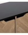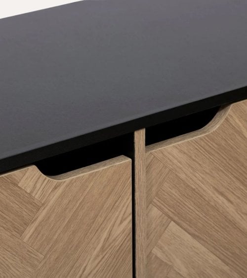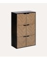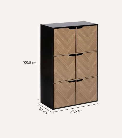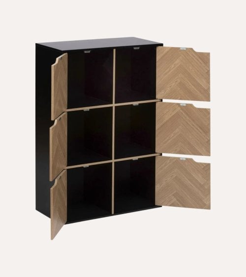 Fabricado en MDF de alta calidad, este estante ofrece durabilidad y resistencia, asegurando que tus objetos estén bien organizados y protegidos. Su acabado en negro mate contrasta perfectamente con las puertas decoradas con un patrón chevron en madera clara, aportando un toque sofisticado y visualmente atractivo a cualquier ambiente.