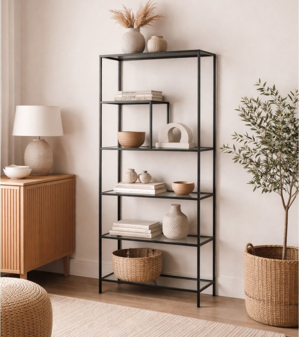 En ALI Hogar, te presentamos la Estantería Asimétrica con 5 Niveles de Hierro y Cristal, una pieza que combina diseño moderno y funcionalidad para transformar cualquier espacio. Fabricada por Ixia, esta estantería destaca por su estructura robusta en hierro negro y sus estantes de cristal transparente, creando un equilibrio perfecto entre resistencia y ligereza visual.